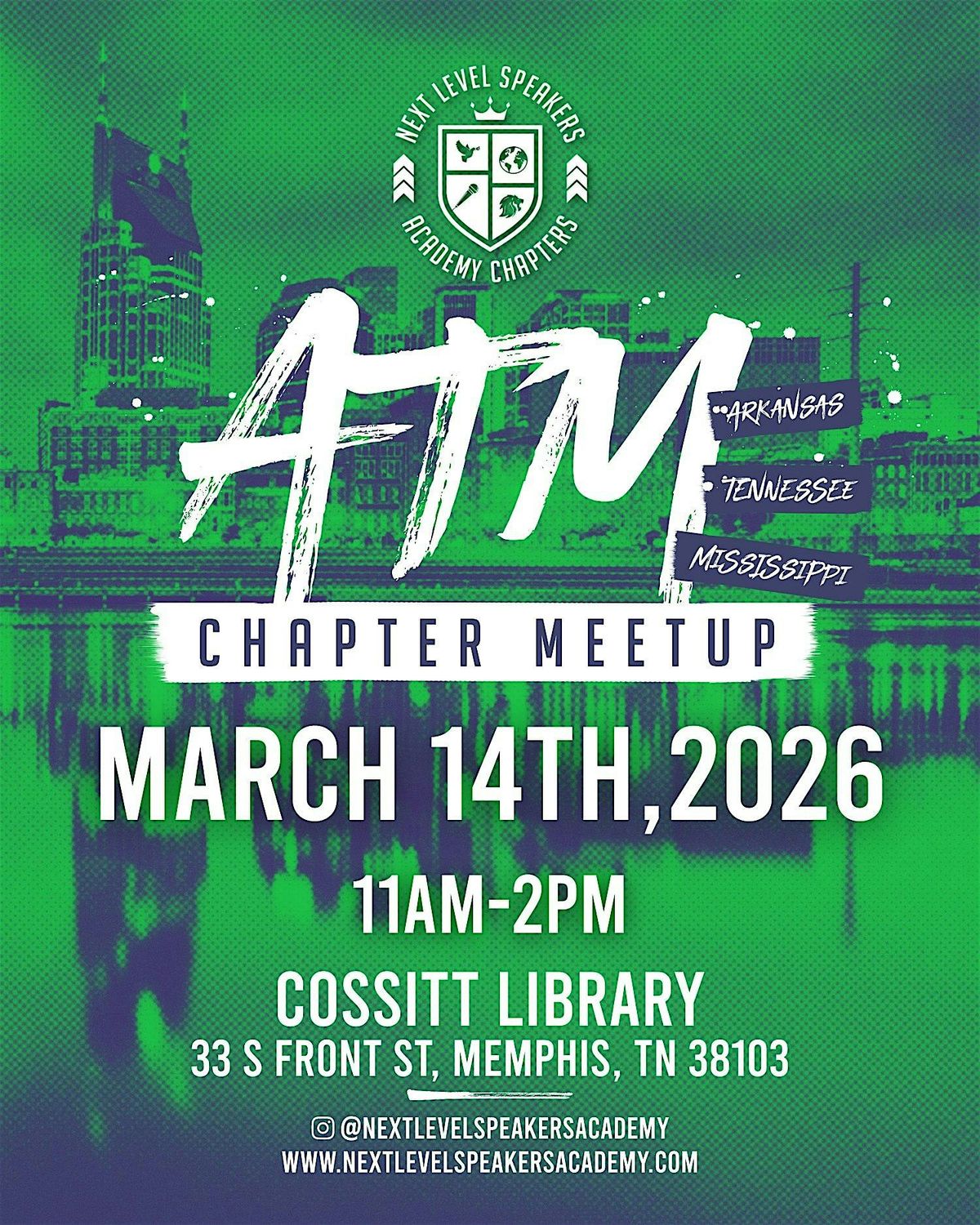 Welcome to the NLSA ATM (Arkansas, Tennessee, Mississippi) Chapter Meet Up! Join us for a networking and speaking event on Saturday, March 14th, 2025 at 11:00 AM. This is a great opportunity to network, share ideas, and connect with like-minded individuals in the speaking industry and beyond. Don't miss out on this chance to expand your gift and have a great time! See you there!