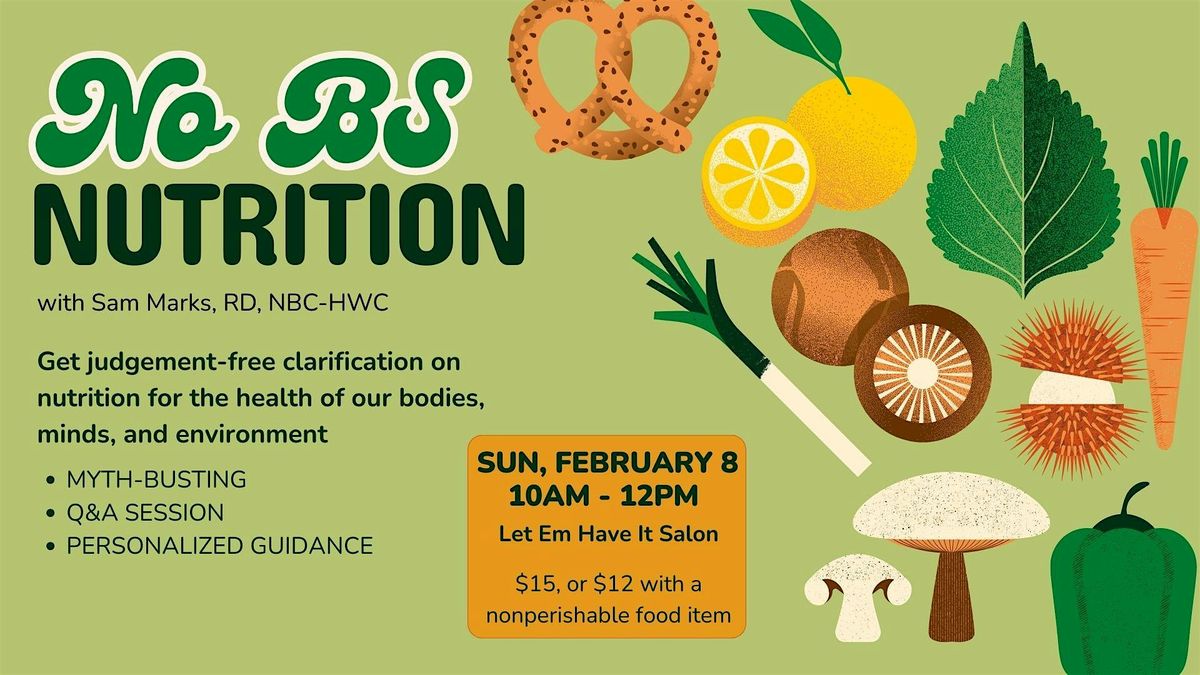 No matter how much nutrition knowledge we've gleaned over the years, or where we got that information, there are always new things to consider and clarify. Even dietitians ask each other questions about nutrition! This event will encompass evidence-based, myth-busting nutrition education, moving onto a Q&A session to clarify any hot topic, then diving into creating a plan that actually works for you and your body. No topic is off-limits (and no question is dumb): food is political, women's bodies deserve more research and care, and there are lots of little things we can do to protect the planet with our food choices. Please bring a pen and paper and come as you are.