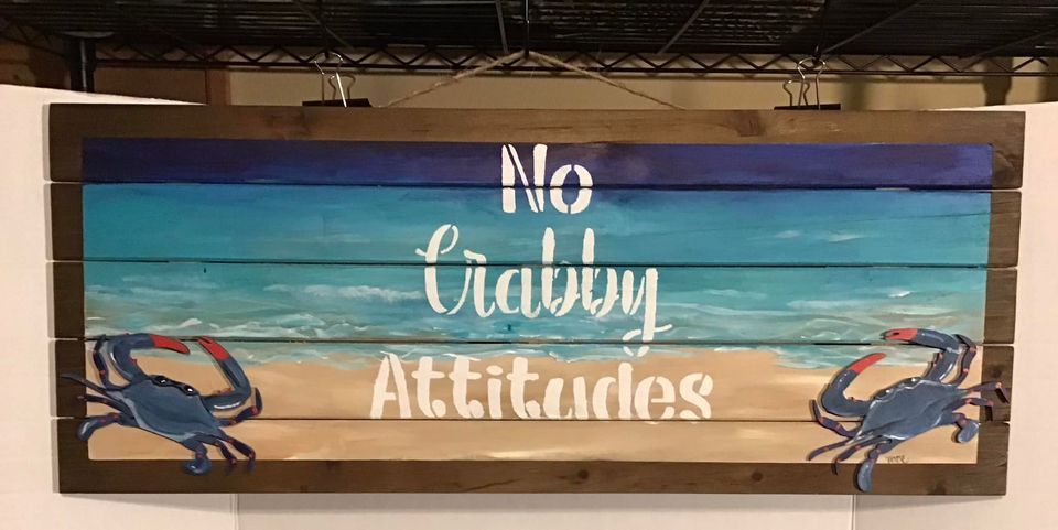 No Crabby Attitudes features adorable 3D crabs that you will paint, in addition to painting the pallet sign and stenciling. $65 Call 904-704-7449 to reserve your seat. :) BYOB permitted.