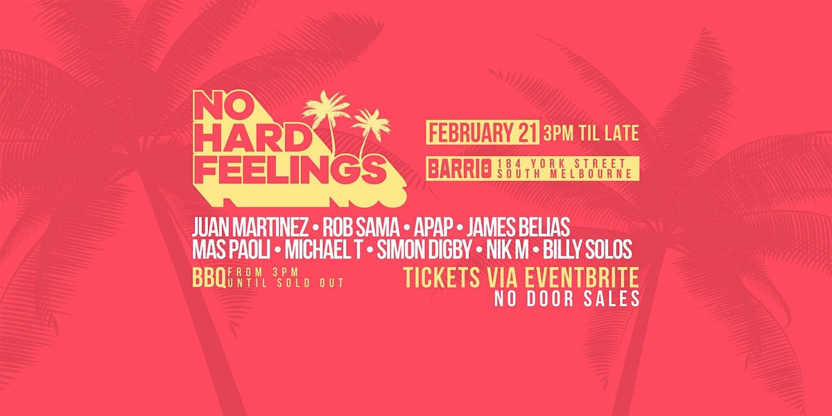 No Hard Feelings is a summer day party where friends and house lovers come together for nothing but good vibes. Touching down at Barrio, South Melbourne, we’re rolling from 3pm ‘til 11pm, turning the day into night with sunshine, sound, and serious energy.