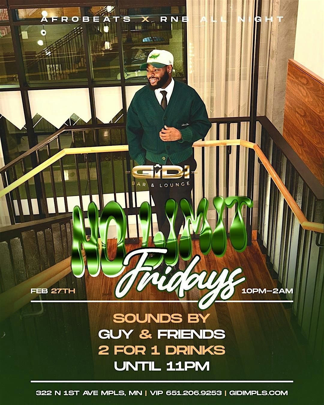 Get ready for No Limit Fridays—where the vibes know no bounds! This Friday, we’re taking you on a musical journey from Afrobeats to R&B to Hip-Hop. Guy & Friends are set to ignite the dancefloor, bringing pure and nonstop energy. Don’t miss out on a night of unforgettable moments!