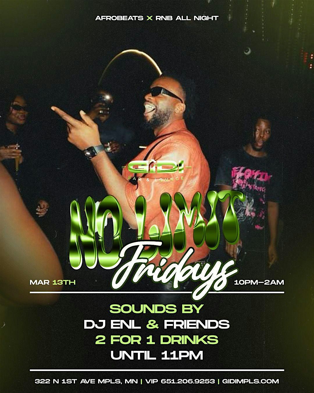 Get ready for No Limit Fridays—where the vibes know no bounds! This Friday, we’re taking you on a musical journey from Afrobeats to R&B to Hip-Hop. DJ ENL & Friends are set to ignite the dancefloor, bringing pure and nonstop energy. Don’t miss out on a night of unforgettable moments!