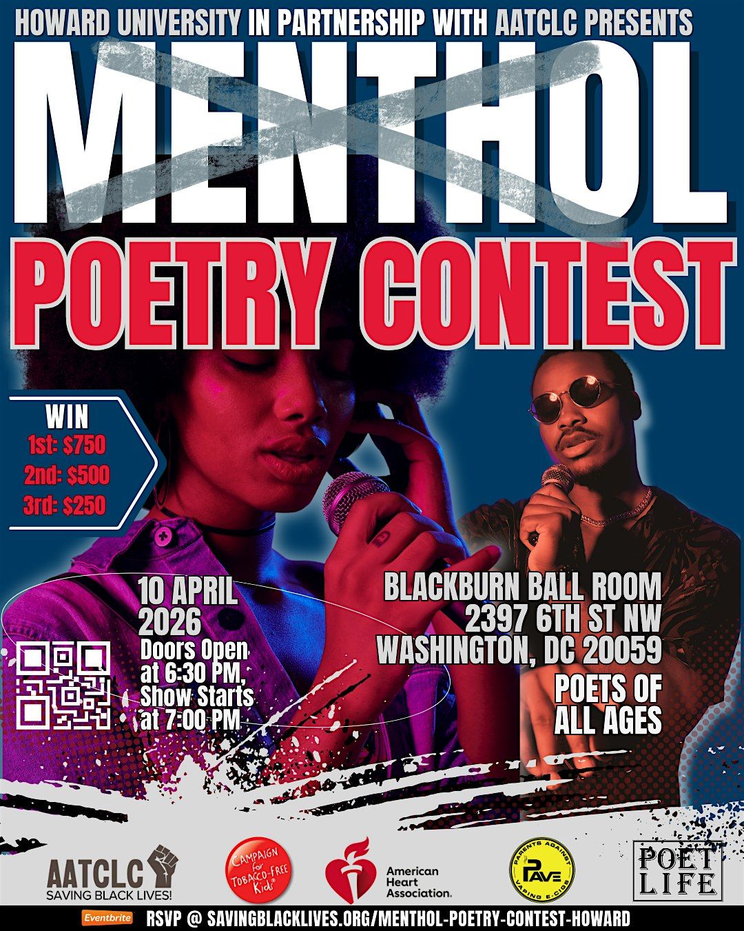 Welcome to the No Menthol Poetry Contest on the campus of Howard University... brought to you by Howard University and the African American Tobacco Control Leadership Council! Join us at The Campbell House for an evening filled with creativity and expression. Whether you're a seasoned poet or just starting out, this event is the perfect opportunity to showcase your talent. Come share your original poems and connect with fellow poetry enthusiasts. Let your words come to life on stage in front of a supportive audience. Don't miss out on this chance to be part of a vibrant poetry community in Orangeburg!