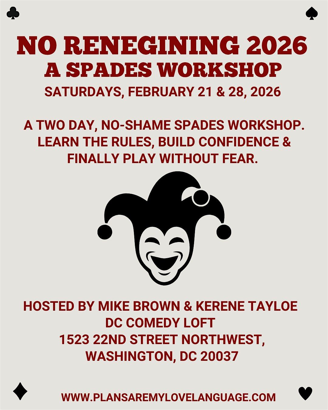 No Reneging 2026: A Spades Workshop is a two-day, no-shame, no-stress experience designed to help participants learn how to play Spades with confidence. Hosted by Mike Brown and Kerene Tayloe, this workshop is for anyone who has ever felt unsure, intimidated, or quietly embarrassed about not knowing the rules of the game. Day one focuses on learning the fundamentals—rules, terminology, strategy, and table etiquette—while day two is all about putting those skills into practice through guided gameplay. Bring your partner, your friends, or anyone who has lived with secret Spades regret. Because it’s 2026—there are no regrets, no pressure, and absolutely no reneging. By the end, you’ll be ready to take a seat at the table and play.
