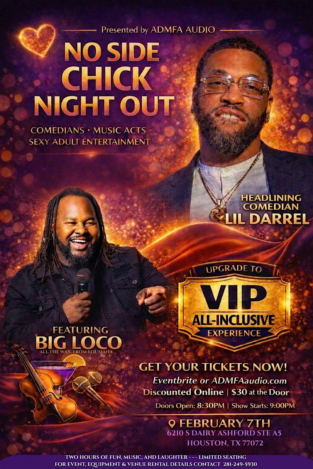 No Side Chick Night Out delivers a high-energy live experience featuring stand-up comedy, music acts, and sexy adult entertainment—all powered by professional audio and visual production inside ADMFA’s private studio.