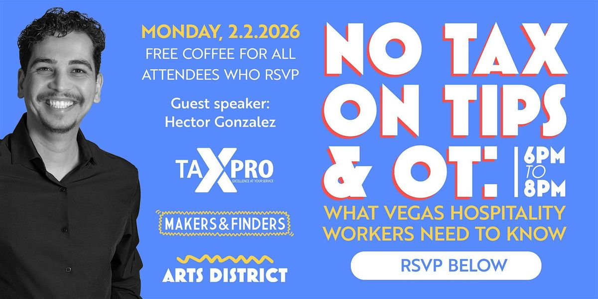 Inviting all Vegas hospitality for a FREE, and easy workshop on how to benefit from the new tax laws for Tips/OT. Join guest speaker Hector Gonzalez, owner of TaxPro, for a simple, straight-to-the-point overview of the new tax laws as they affect tip and OT earners.