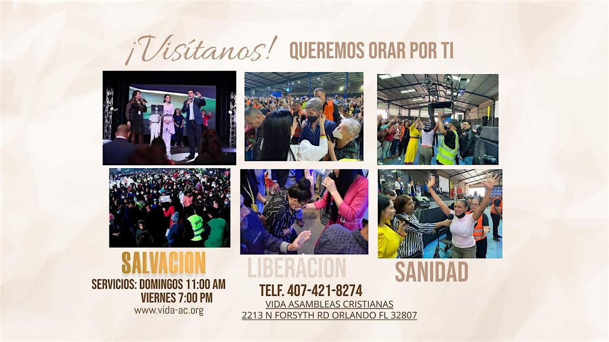 ¡No te pierdas la Noche de Avivamiento- Sanidad y Liberación! Ven y únete a nosotros todos los Viernes a las 7:00 p.m. en VIDA CHURCH - 2213 N Forsyth Rd, Orlando FL 32807. ¡Será una noche sobrenatural con el poder del Espíritu Santo , llena de fe, esperanza y sanidad, liberación, milagros! Prepárate para experimentar el poder de Dios. ¡Te esperamos, invita a tu familia y amistades! Entrada gratis .