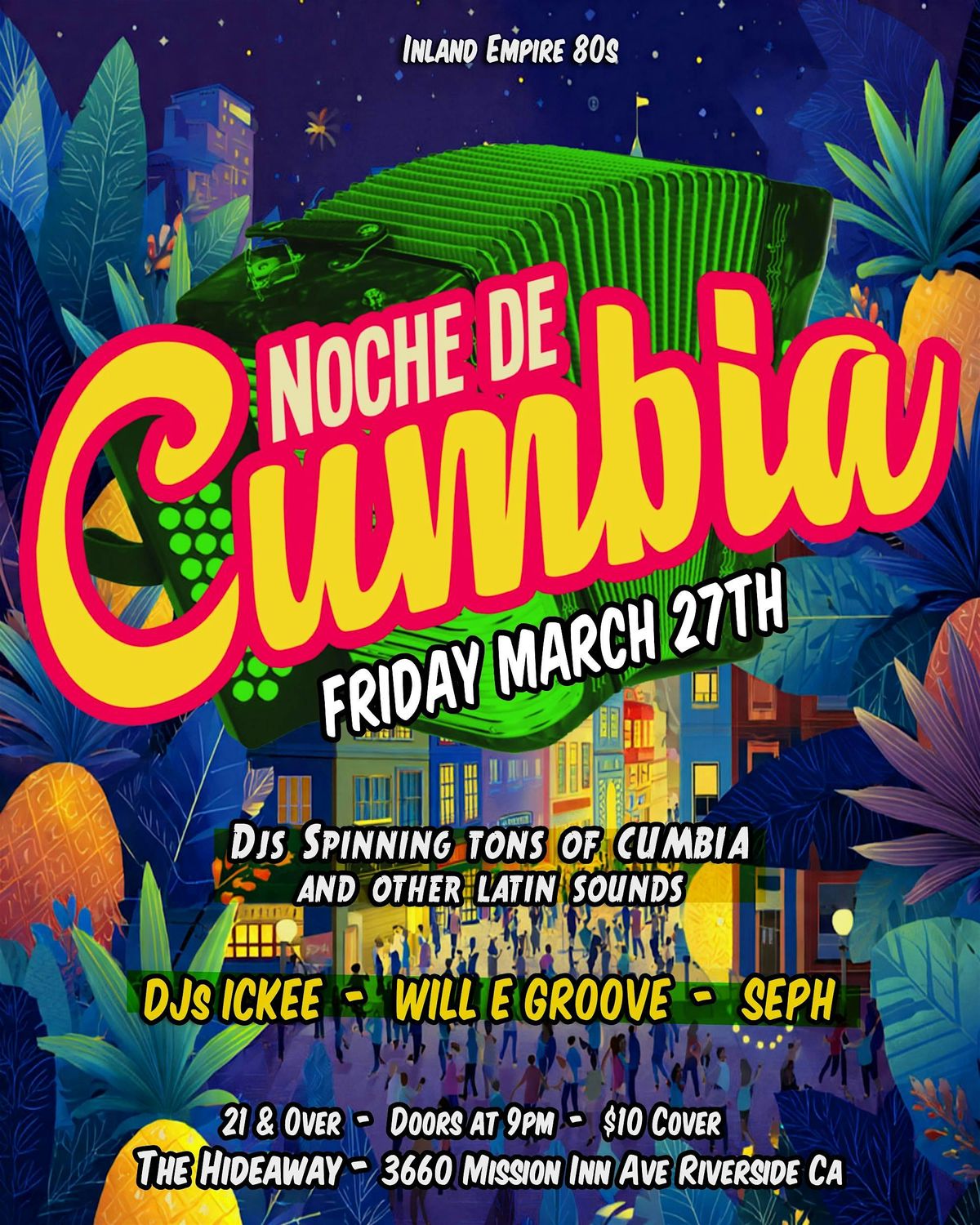 Friday March 27th at The Hideaway in Riverside! Don't miss the next Noche De Cumbia!