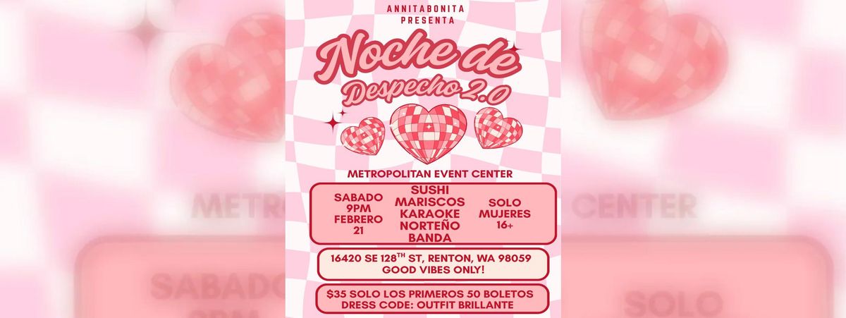 Experience the exciting event 'NOCHE DE DESPECHO 2.0' at Metropolitan Banquet Hall , Renton, WA, United States. This must-attend gathering promises an unforgettable experience for all attendees. Join us for a day filled with innovation, networking, and inspiration. Reserve your place now for an unparalleled exciting experience. #NOCHEDEDESPECHO2.0 #event #exciting #RentonEvents #WAEvents
