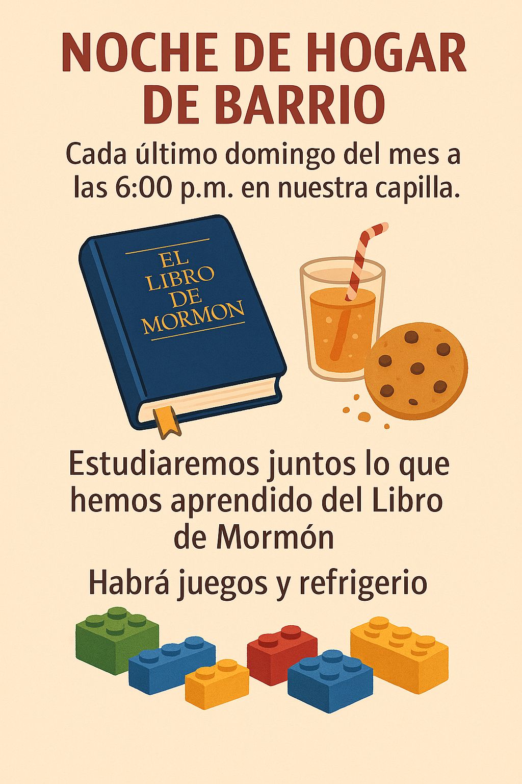 Acompañanos a la noche de hogar mensual del barrio. Durante el año estaremos estudiando el Libro de Mormon. Cada noche de hogar estaremos estudiando lo que hemos aprendido en nuestro estudio diario de el Libro de Mormon. Tambien tendremos juegos y refrigerio. Ven, y disfruta con nosotros!