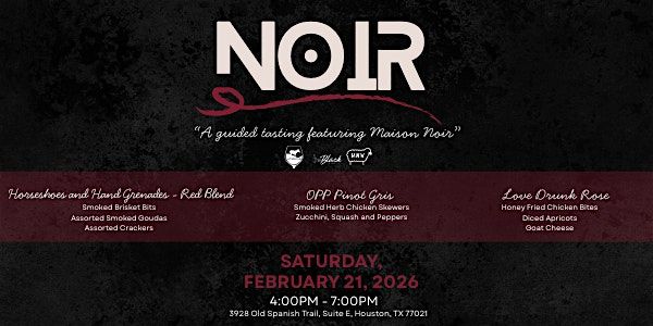 A guided tasting experience featuring the bold wines of Maison Noir Wines, paired with elevated smoked bites. Guests will explore a curated selection of reds, whites, and rosé, each thoughtfully matched to enhance flavor and depth. Join us for an intimate evening of wine education, rich pairings, and noir-inspired ambiance. 🍷🖤