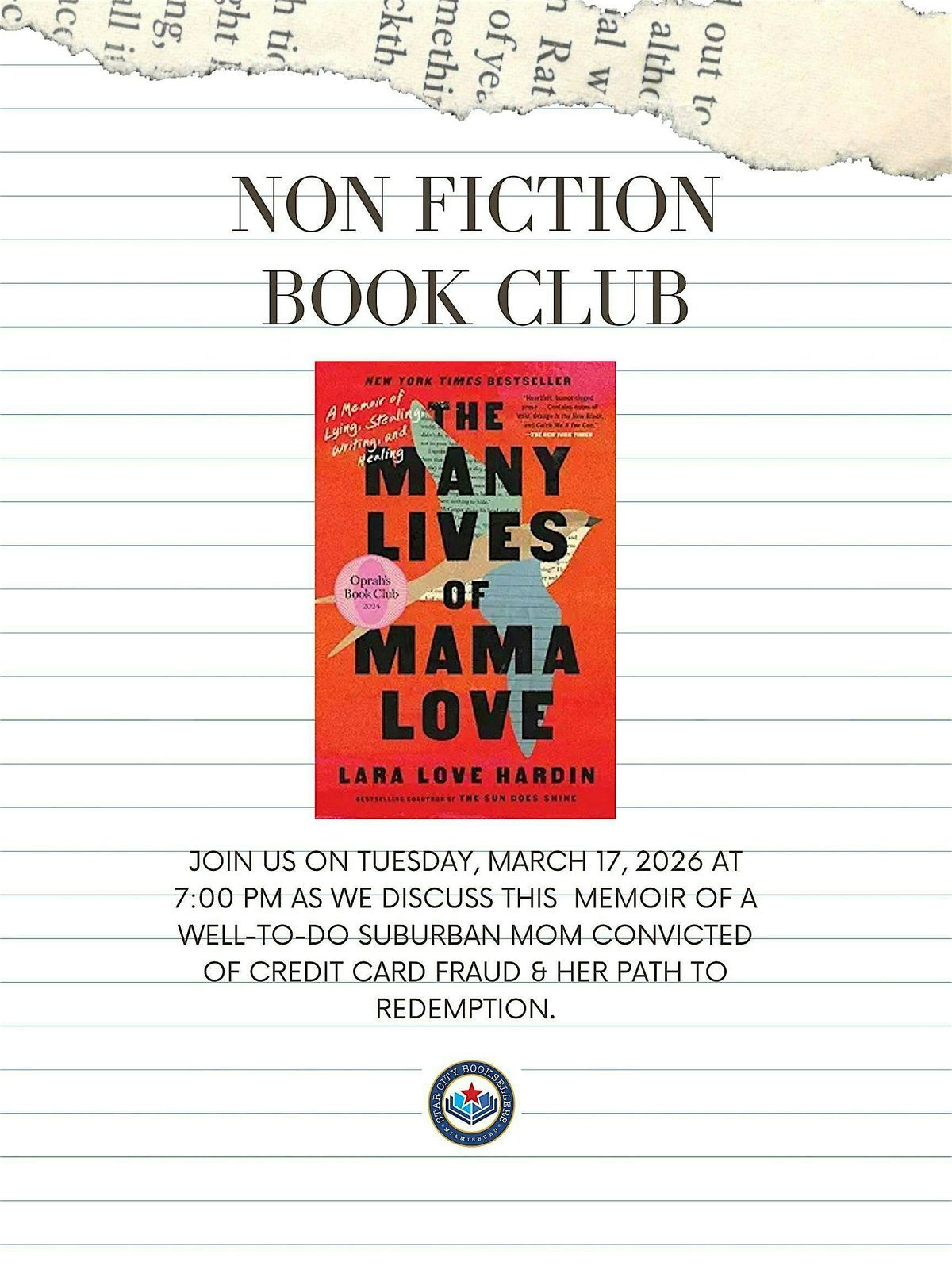 Join us for our monthly Non-Fiction Book Club as we discuss "The Many Lives of Mama Love" by Lara Love Hardin. This memoir discusses the author's decent into substance use her time spent in federal Pr*son, and her path to redemption.