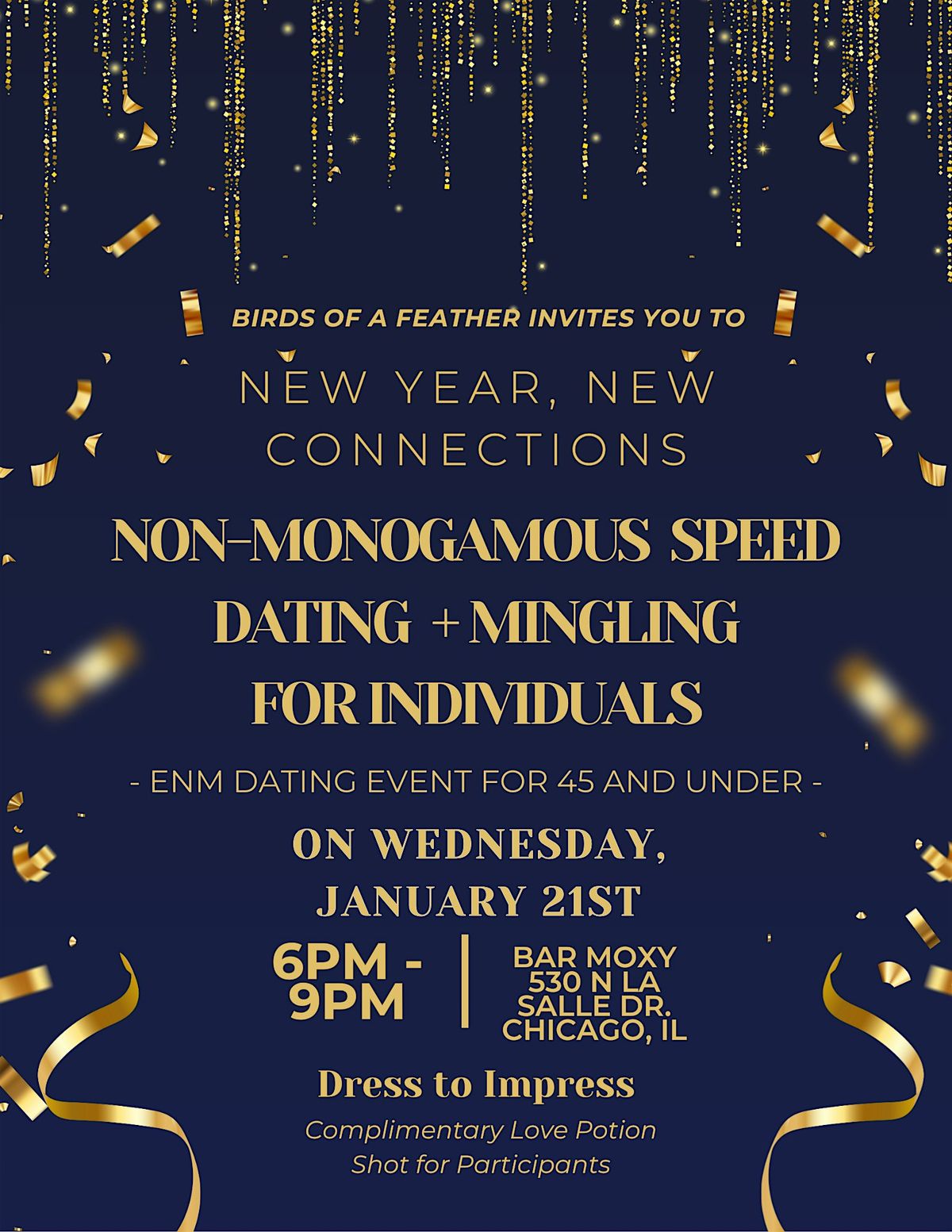 We invite you to a unique evening of connection designed for individuals 45 and under who are interested in being ethically non-monogamous. Yes, we will check identification, and if you are over 46+ you will be turned away with no refund. This semi-exclusive event provides a safe, welcoming space for singles and solos to meet like-minded individuals.
