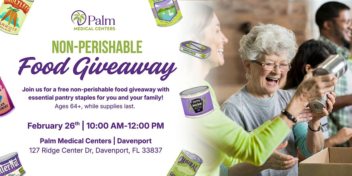 Join us for our Non-Perishable Food Giveaway event! Join us at Palm Medical Centers - Davenport on February 26, 2026 from 10:00 AM to 12:00 PM and receive essential pantry staples for you and your family!*