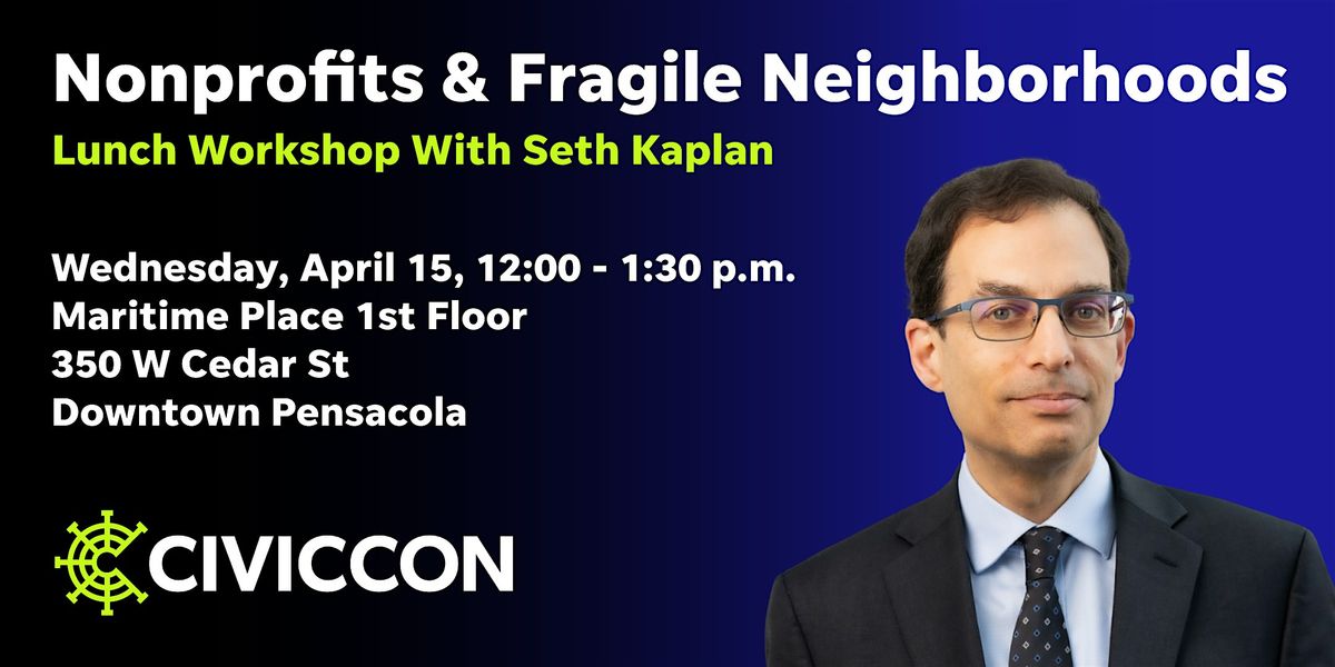 Seth Kaplan will also be delivering a free public CivicCon presentation in Pensacola on Tuesday, April 14 (Register for that here). This luncheon offers a more focused setting for nonprofit leaders to engage directly with the ideas from Fragile Neighborhoods and apply them to their work.