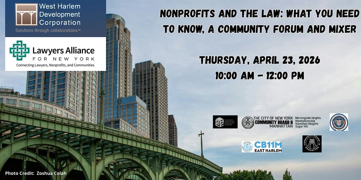 Join us for a FREE and engaging forum with attorneys from Lawyers Alliance on the legal issues every nonprofit should know. Then stick around and mingle with fellow nonprofit leaders and community members who are all driving change across Northern Manhattan!