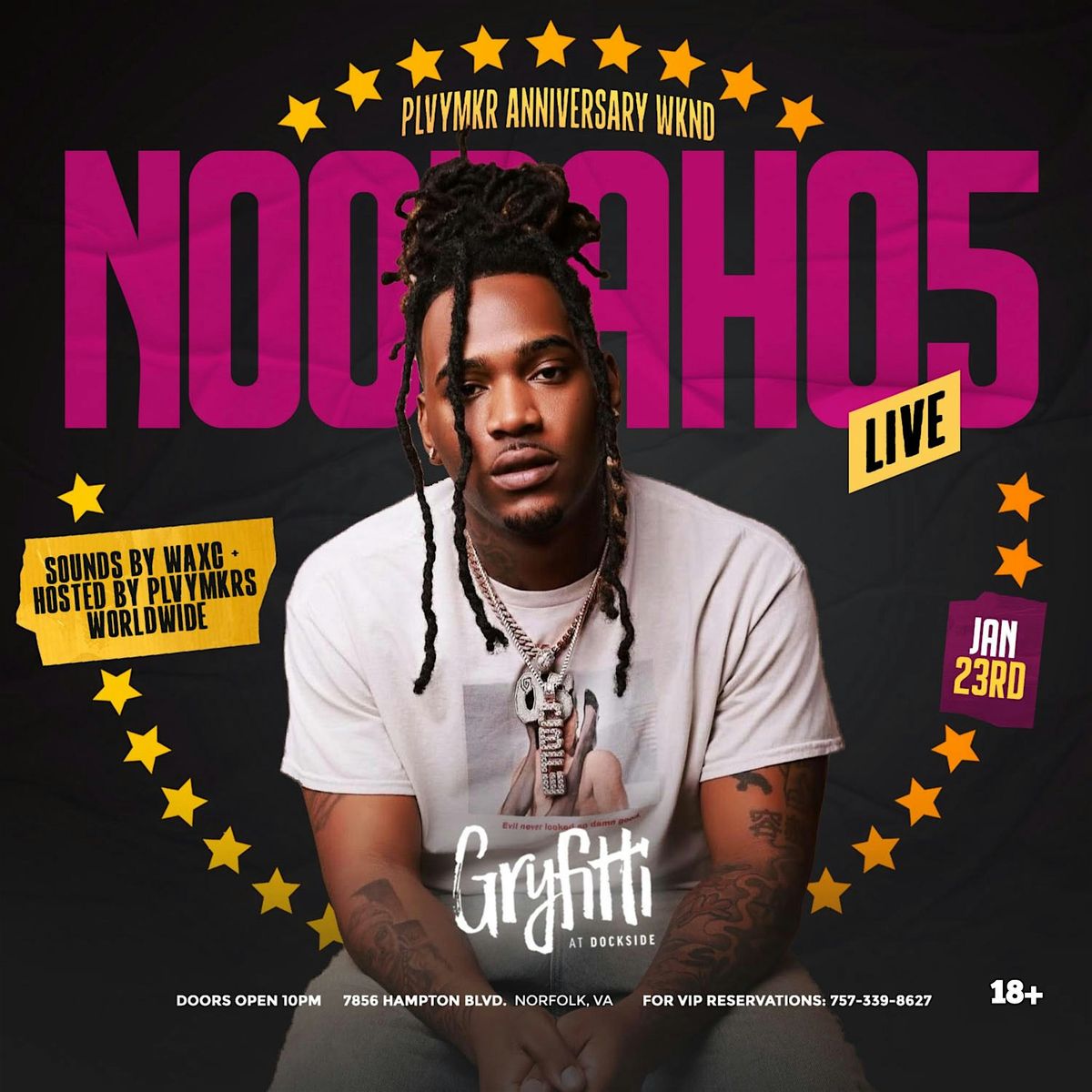 Welcome to Noodah 05 Live at Gryfitti! Get ready to experience an unforgettable night at Gryfitti at Dockside on January 23, 2026 at 10:00 PM (Eastern Time). Join us for an evening filled with amazing music and great vibes. Don't miss out on this epic event!