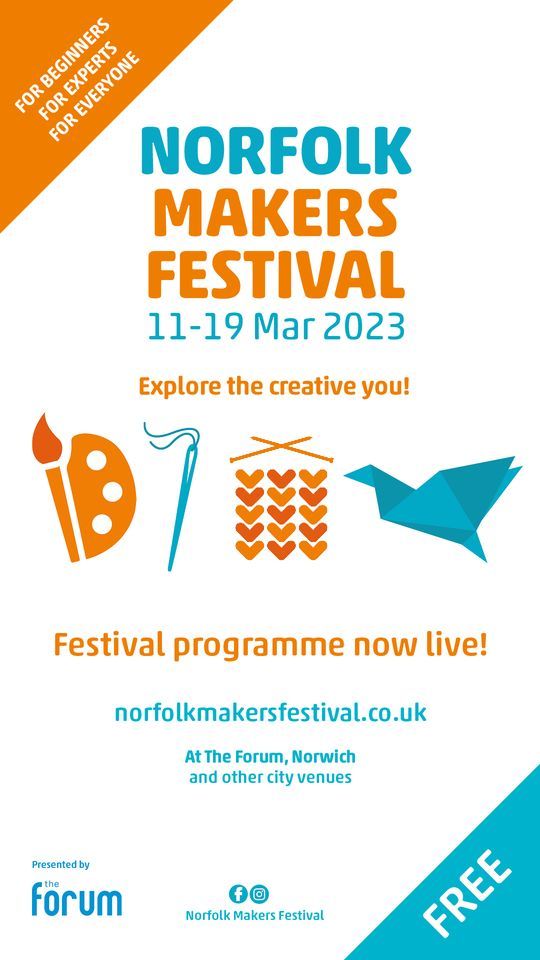 Explore the creative you!Norfolk Makers Festival 2023 will offer nine days of FREE exhibitions, creative activities and inspiring demonstrations, plus workshops, talks and lots of crafty conversation! There will be something new to see and do, everyday.