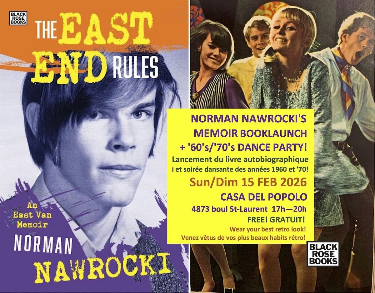 Black Rose Books announces the launch of Norman Nawrocki's newest book, The East End Rules, An East Van Memoir on Sunday February 15, at the Casa del Popolo, 5pm to 8pm, 4873 boul St-Laurent. The free event— Norman Nawrocki's Memoir Booklaunch and 1960's/70s Dance Party— will also celebrate his birthday the day before. Attendees are invited to wear their best '60s or '70s outfits.
