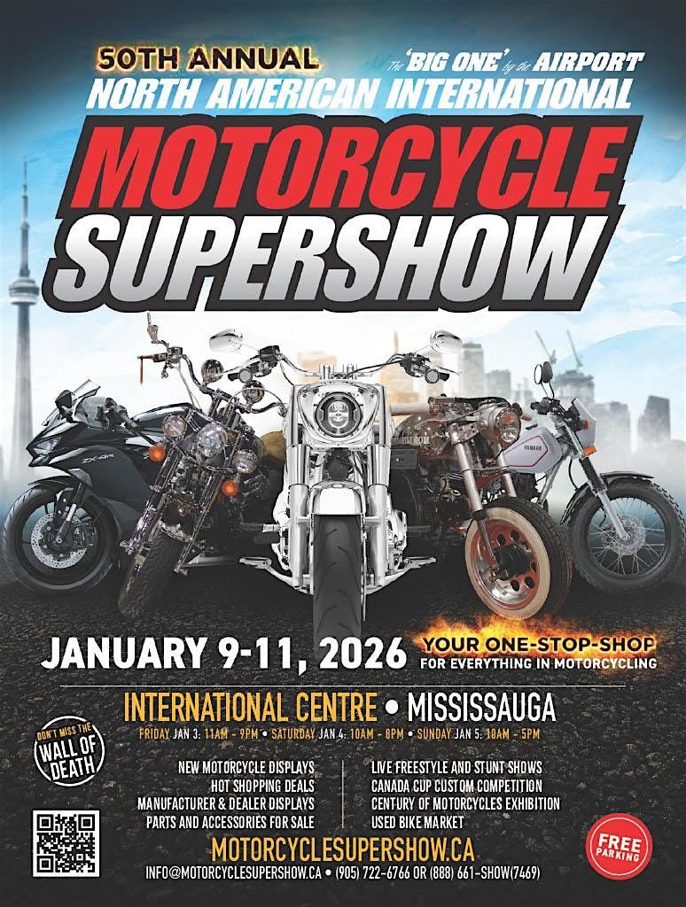 Come join us at International Centre, 6900 Airport Rd, Mississauga for the largest Motorcycle Show in North America. No matter what kind of two-wheel motorcycles interests you its all at the International Centre, January 9-11, 2026. Themed Halls make it easy to navigate be sure to see them all - Industry, Touring, Vintage, Racing, Custom and Off-Road. This isn't just a Trade Show it's an Event, filled with high-octane action, jaw-dropping live freestyle stunts, the Motorcycle Wall of Death and the latest and greatest in the world of motorcycles.