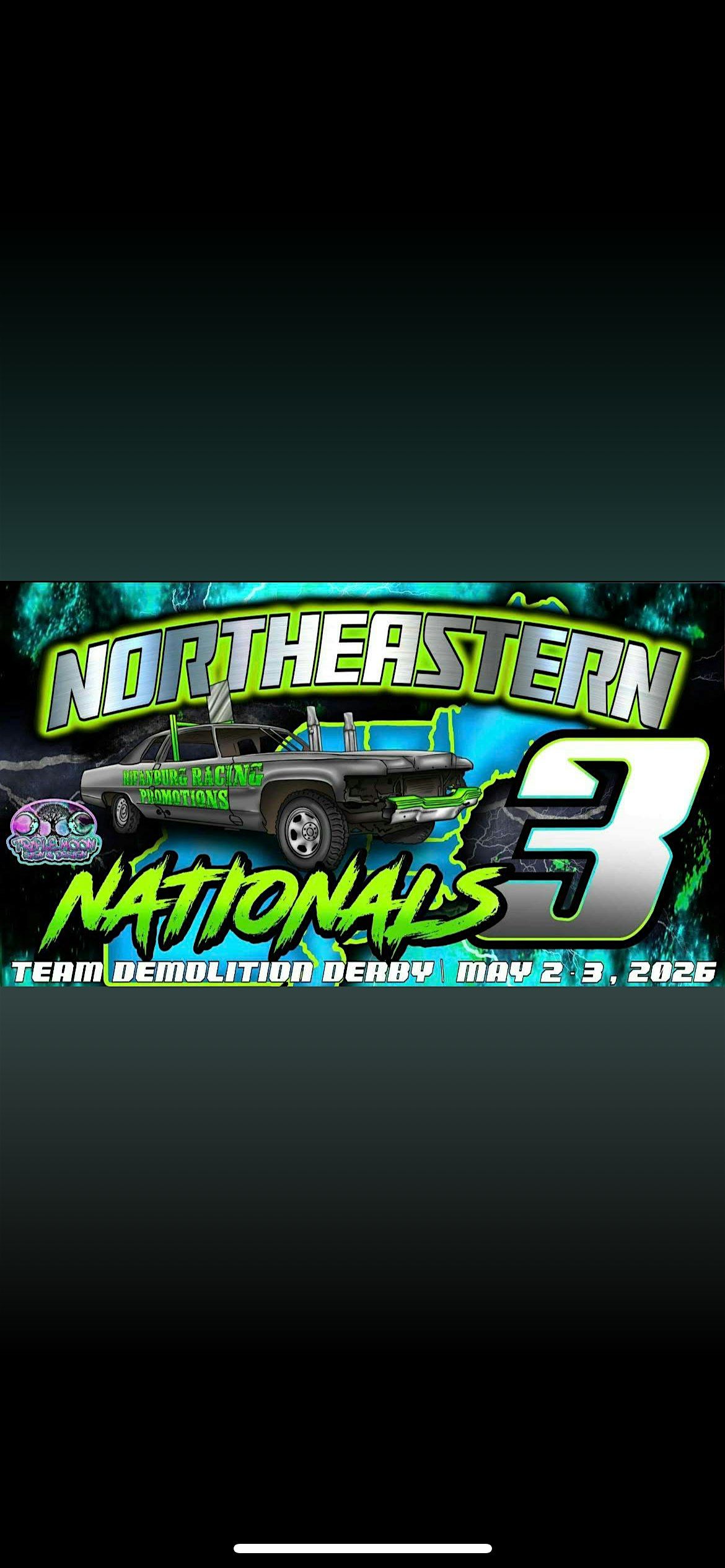 Welcome to the Northeastern Nationals 3.0 Demolition Derby happening at Chenango County Fairgrounds from May 1st-3rd, 2026 (Eastern Time)! Get ready for a day filled with adrenaline-pumping action as cars crash and smash their way to victory. Don't miss out on the excitement and join us for a memorable experience. This weekend will be packed with 3v3 team demolition derby format along with multiple one and done filler classes. see you there!