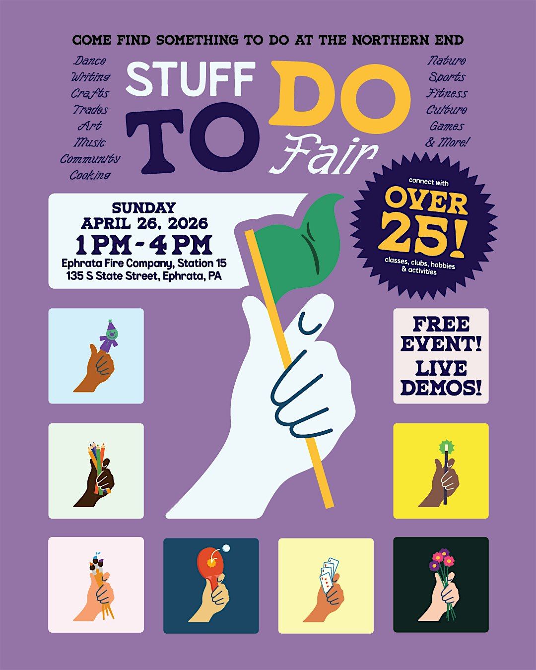 Want to try a new skill? Get more involved in your community? Meet new friends? You'll find all this AND MORE at the Northern End Stuff To Do Fair! Hosted in partnership with the Lancaster County Local Journalism Fund, this free event invites Lancastrians of all ages to browse groups from gardening to fitness to art to performance and beyond. This is a family-friendly event that features things to do for both adults and children. Exhibitors will be available to answer your questions, offer more information about their meetings, and welcome you to their next event.