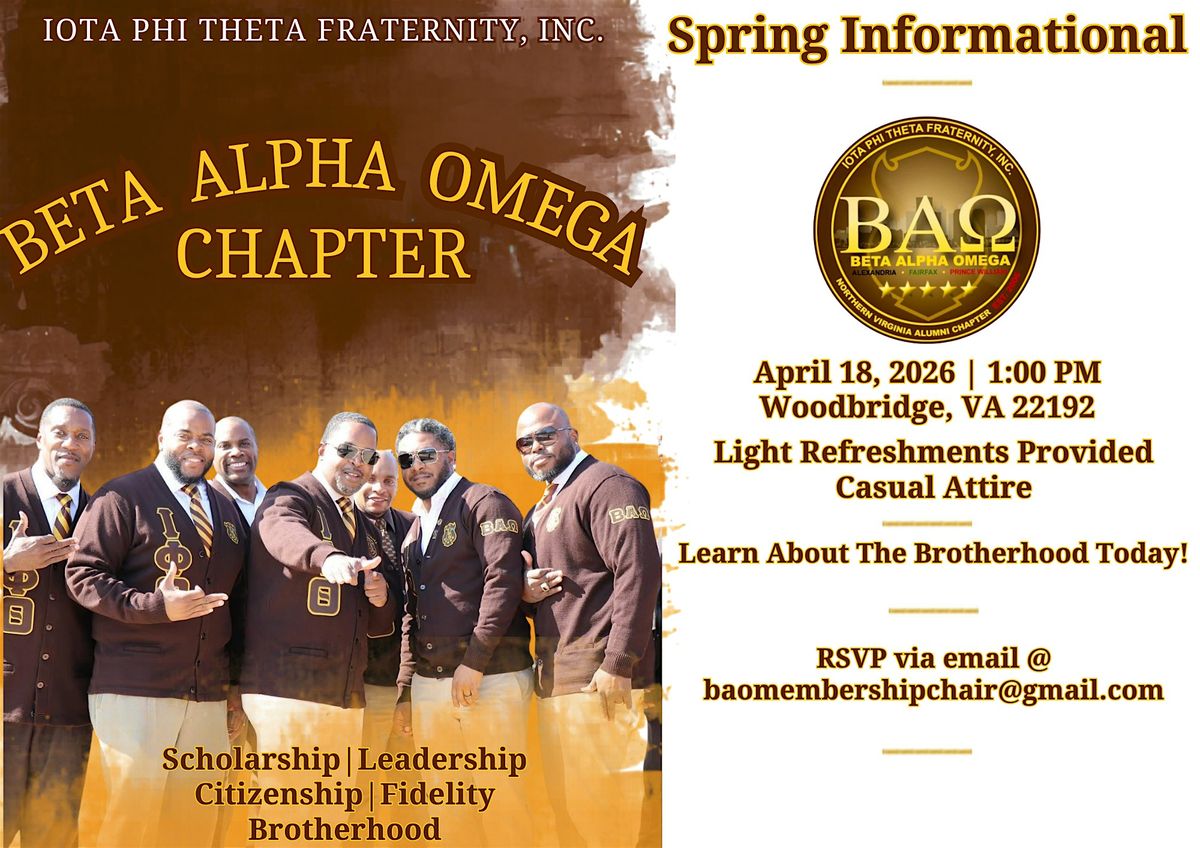 We invite all Men interested in joining an organization that stands on the principles of leadership, scholarship, citizenship, fidelity, and brotherhood. We are a fraternity born out of the Civil Rights Movement in 1963 by 12 non-traditional students at Morgan State University. The Beta Alpha Omega chapter serves all of the surrounding Northern VA communities including Fredericksburg-Stafford, Prince William, Fairfax, Alexandria, Arlington, , and Loudoun Counties. Iota Phi Theta is more than a Fraternity, We are a Movement!