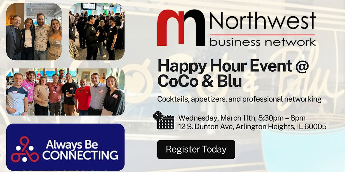 Join Northwest Business Network and Always Be Connecting for this great opportunity to mingle with local go-getters, and to grow your business network. You'll get to participate in a casual event with natural networking, making connections that are not forced, but organic. What better way to network than at CoCo & Blu in Arlington Heights with some of their delicious cocktails and appetizers!
