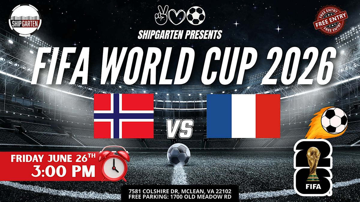 FRIDAY AFTERNOON. POWER VS PRECISION. Norway brings strength, physicality, and fearless attacking football. France brings world-class talent, speed, and championship mentality. 3PM kickoff. Weekend energy starting early. Shipgarten becomes the biggest World Cup watch party in Tysons. THIS IS HOW YOU WATCH A FRIDAY MATCH You leave work early. You grab a cold one. You don’t miss a goal. Massive screens & stadium-level sound $40 Mix & Match Beer Buckets (5 – 16oz cans) 100+ beer varieties available All ages welcome (21+ to drink) The most energetic World Cup crowd in Tysons This isn’t background noise. It’s full matchday atmosphere. STRENGTH MEETS CHAMPIONSHIP DNA Norway’s power and direct style. France’s technique and elite finishing. Friday at 3PM means the party starts early and doesn’t slow down. Come early. Stay late. Celebrate big. GAME DAY DETAILS Friday, June 26th Kickoff: 3:00 PM Shipgarten – 7581 Colshire Dr, McLean, VA 22102 FREE & large parking at 1700 Old Meadow Rd FREE ENTRY – Pay only for what you consume Coming with your crew? Upgrade your match day. The biggest crowd. The coldest beer. The loudest World Cup in Tysons.