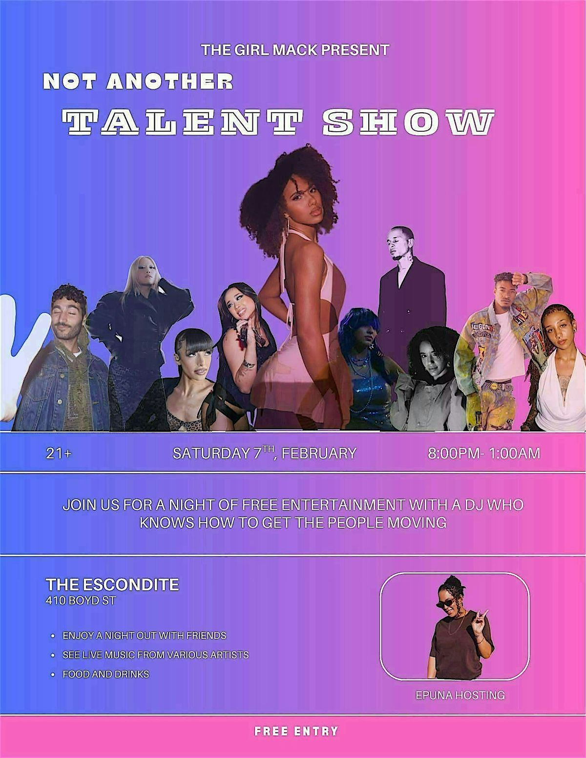 Get ready for an epic evening full of surprises and amazing skills at the Not Another Talent Show! Join us in person to witness some seriously cool acts and cheer on local talent. Whether it’s singing, dancing, magic, or something totally unexpected, this show’s got it all. Bring your friends, grab some snacks, and enjoy the fun vibes. Don’t miss out on a night that’s anything but ordinary!