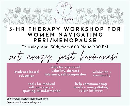 This 3-hour workshop is a therapist-led, psychoeducational offering designed to support women navigating perimenopause and menopause. The content is grounded in current, evidence-based research, including work by Jen Gunter and other leading menopause clinicians and organizations.
