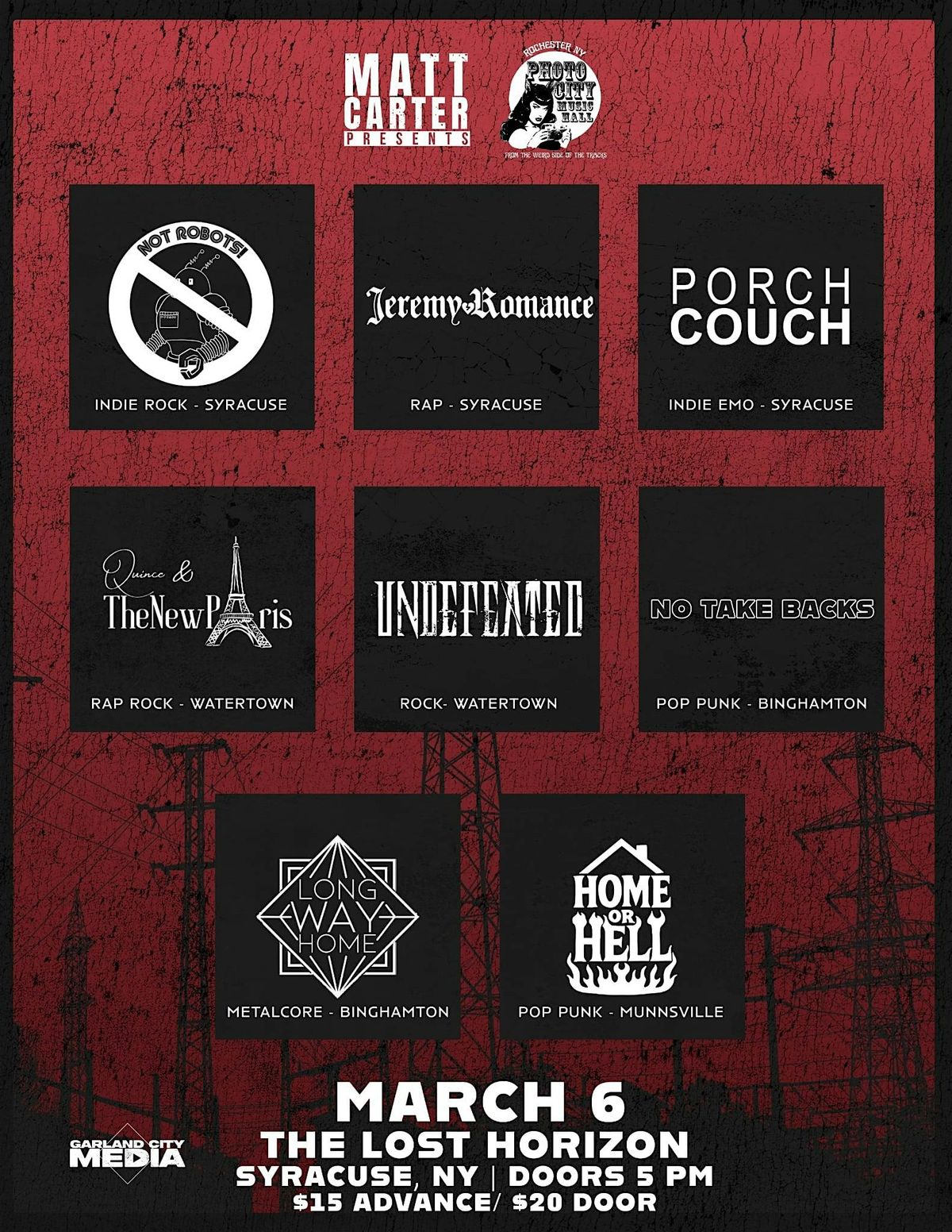 Not Robots, Jeremy Romance & The Cool Kids, Porch Couch, Quince & The New Paris, Undefeated, No Take Backs, Long Way Home, & Home Or Hell