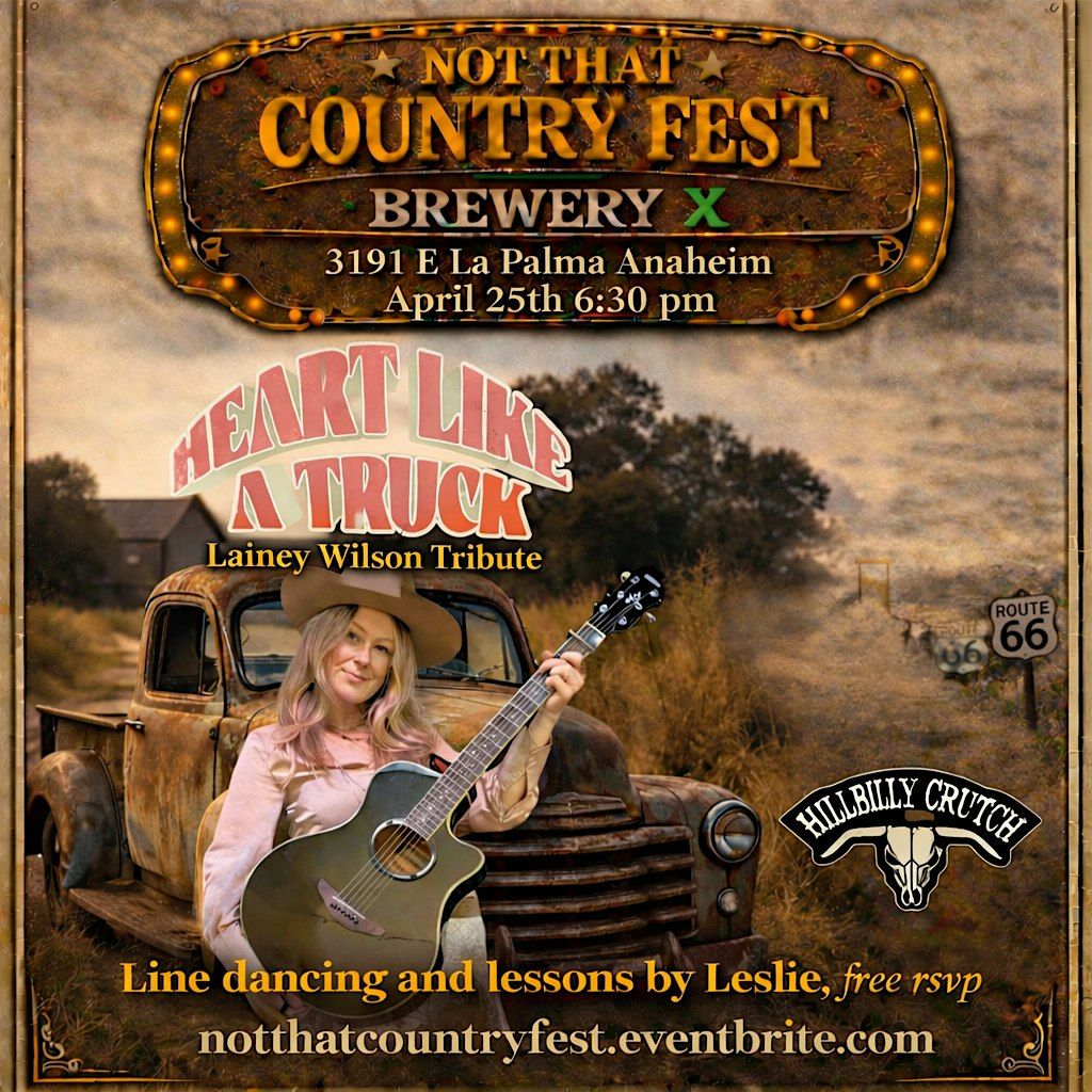 Not that Country Fest featuring the Heart Like a Truck- Lainey Wilson Tribute and some stagecoach favorites/originals at Brewery X in Anaheim April 25. Get ready for an epic night featuring Heart Like a Truck along with Hillbilly Crutch rocking the stage at Brewery X! Hillbilly Crutch will be performing a set of past/current Stagecoach bands and some originals. Country Girl in Boots-Leslie Per will be teach dance lessons and keep you dancing all night with some great country music. Join us on April 25, 2026 at 6:30 PM (PDT) for some killer country music, great vibes, and an unforgettable live experience. Bring your friends, grab a beer, and let’s make it a night to remember! RSVP here on Eventbrite!!