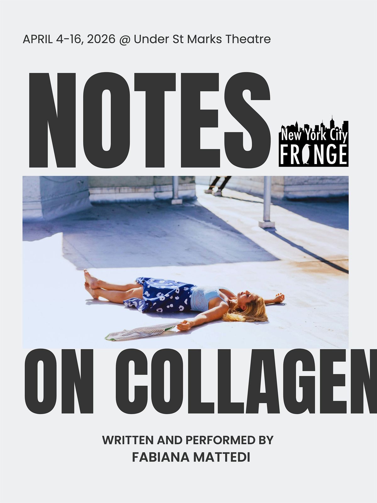 Written and performed by storyteller and actress Fabiana Mattedi, NOTES ON COLLAGEN is a comic and heartfelt reckoning with beauty, aging, and identity. In this one-woman show, Mattedi blends sharp humor with poignant self-reflection as she interrogates the paradoxes of beauty — its power and its poison, its promise and its price. From the pressures of “aging gracefully” to the subtle violence of societal expectations, NOTES ON COLLAGEN invites audiences to laugh, think, and confront the invisible forces that shape how we see ourselves — and each other. Poignant, biting, and unexpectedly funny, this one-woman show dares to ask: what happens when we stop trying to preserve ourselves and start claiming ourselves instead?