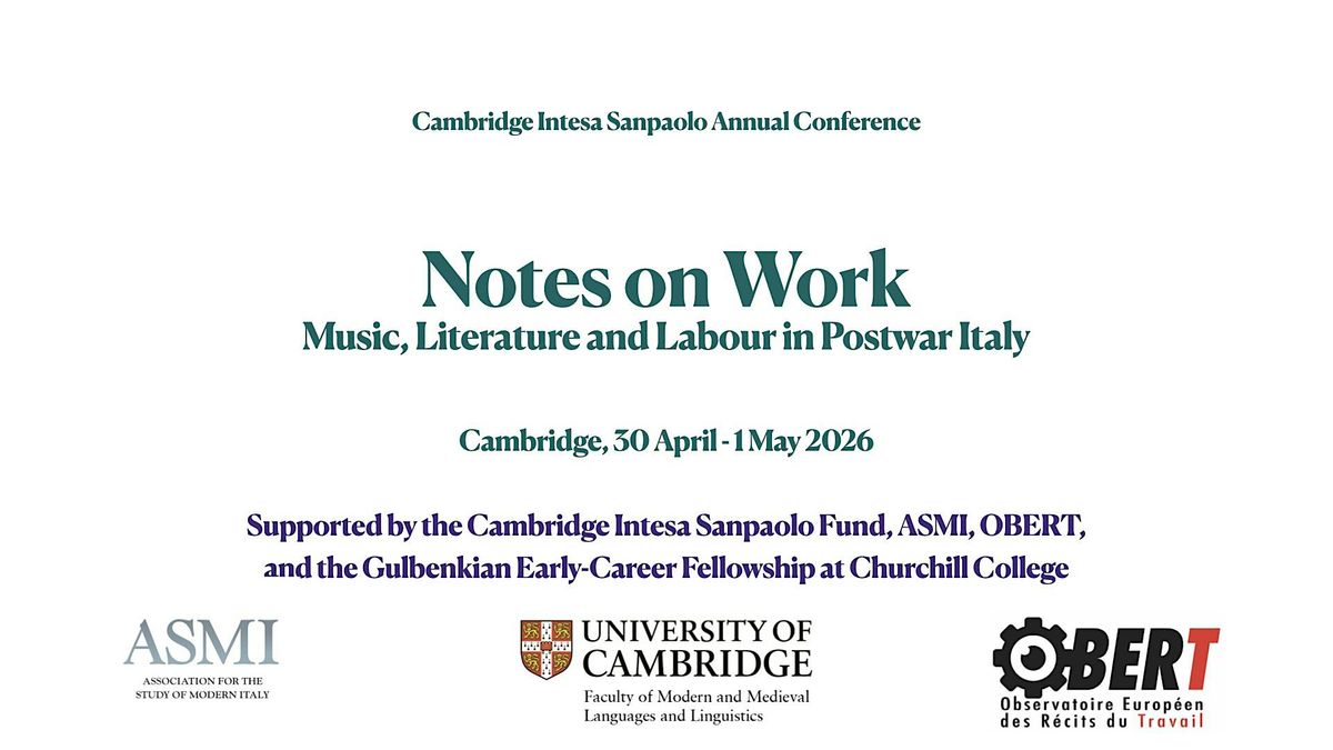 The event is part of the Cambridge Intesa Sanpaolo Annual Conference. It is generously sponsored by the Cambridge Intesa Sanpaolo Fund, ASMI (Association for the Study of Modern Italy) and the Gulbenkian Early-Career Fellowship in the Arts and Humanities at Churchill College. The event is organised in collaboration with OBERT (Observatoire Européen des Récits du Travail / European Observatory of Labour Narratives).