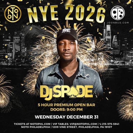 ? Gift this experience to your loved ones! Click here to check out our gift card. ⭐ NOTO NYE 26 is the ultimate New Year’s Eve club party in Philadelphia, PA! Get your tickets now for the NOTO NYE 26 party! Highlights ? Celebrate with DJ Spade, spinning electrifying sets all night long! ? Enjoy a 5-hour open bar with complimentary champagne at midnight! ? Dance on a massive floor surrounded by cutting-edge lights and sounds! ? Experience an unforgettable countdown to the New Year with friends! General Info ? Age requirement: 21+ with valid ID ♿ Accessibility: Not accessible ? Location / Venue: 1201 Vine St Parking, Philadelphia, PA ? Dress code: Trendy club attire ? Genre: Hip Hop, Top 40 Description Join us for an unforgettable night at NOTO Philly, where the energy of New Year’s Eve comes alive! With DJ Spade at the helm, expect heart-thumping music and a vibrant atmosphere as we dance our way into the New Year. As the clock approaches midnight, raise your glass for a toast to new beginnings while surrounded by friends and fellow partygoers. This is not just a party; it’s a celebration of life, music, and memories waiting to be made. Grab your tickets for NOTO NYE 26 in Philadelphia, PA, and let’s make this New Year's Eve one for the books!
