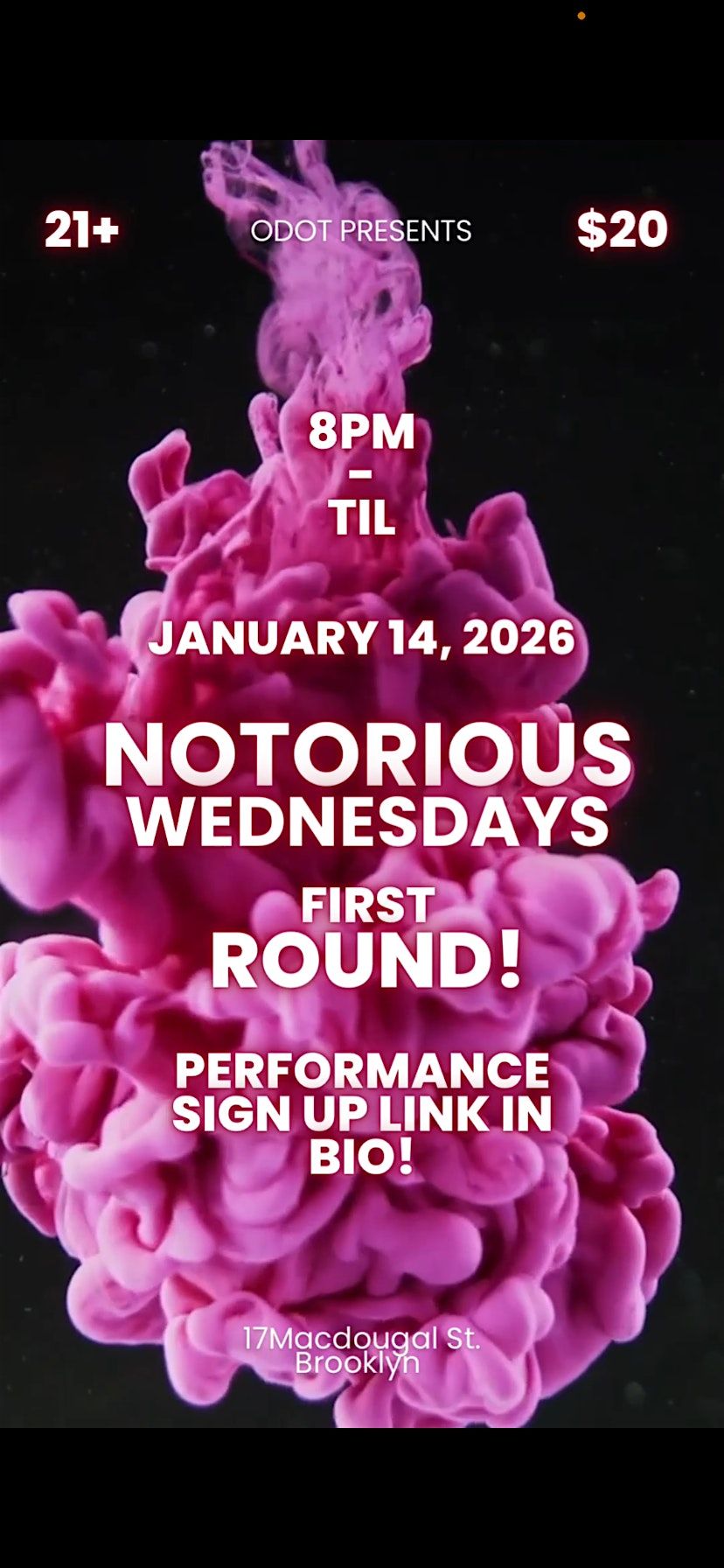 Welcome to NOTORIOUS WEDNESDAYS: The First Round Performances! Join us at 17 MacDougal St on January 14, 2026 at 8:00 PM (Eastern Time) for a night of incredible talent and unforgettable moments. Get ready to be amazed by the performances lined up for this special evening. Don't miss out on this opportunity to witness some of the best local artists in action! ALL TALENT ARE WELCOME !TO SIGN UP AND PERFORM! Mark your calendars and come ready to have a great time with us!