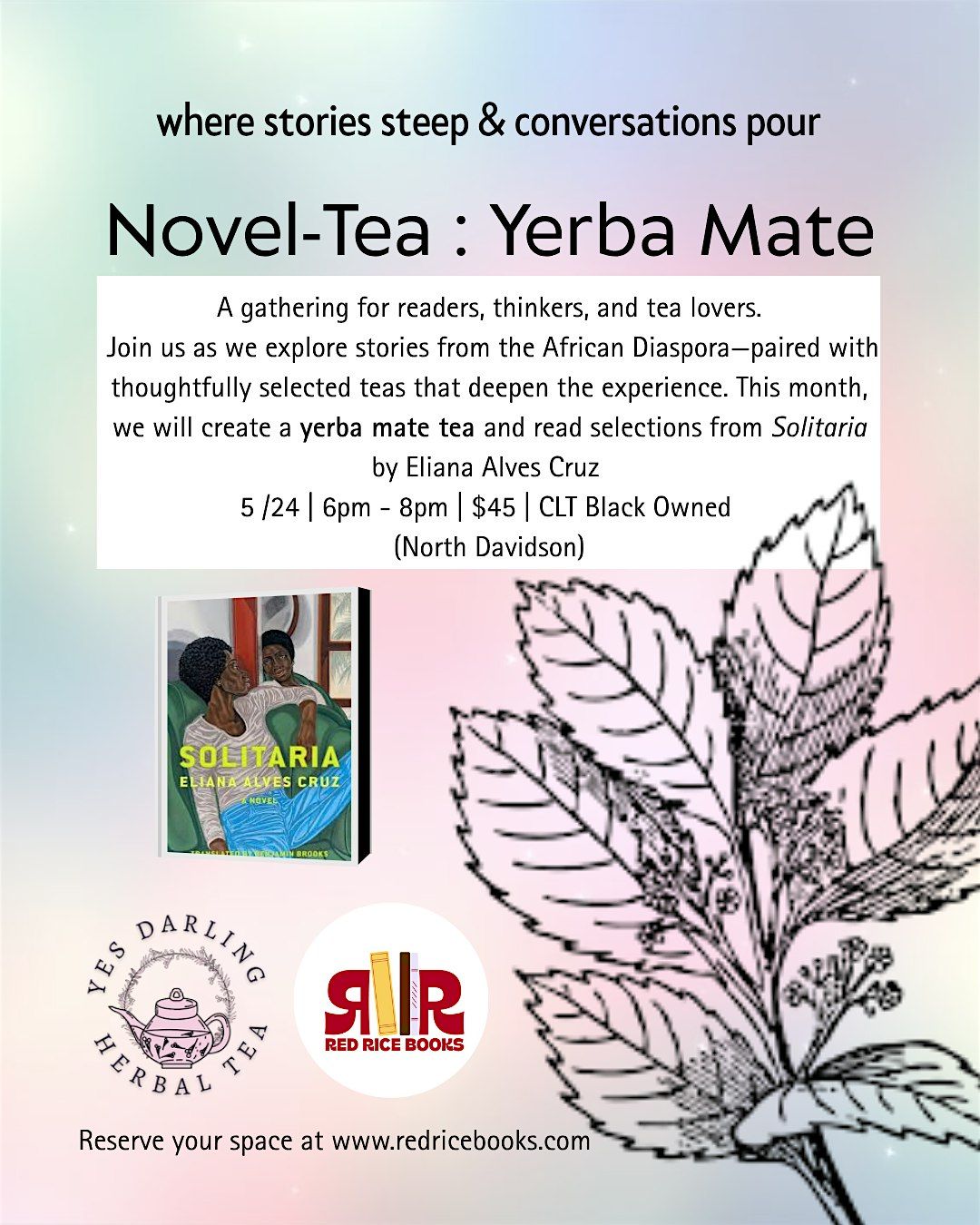 Join us as we explore stories from the African Diaspora—paired with thoughtfully selected teas that deepen the experience. This month, we will create a yerba mate tea and read selections from Solitaria by Eliana Alves Cruz