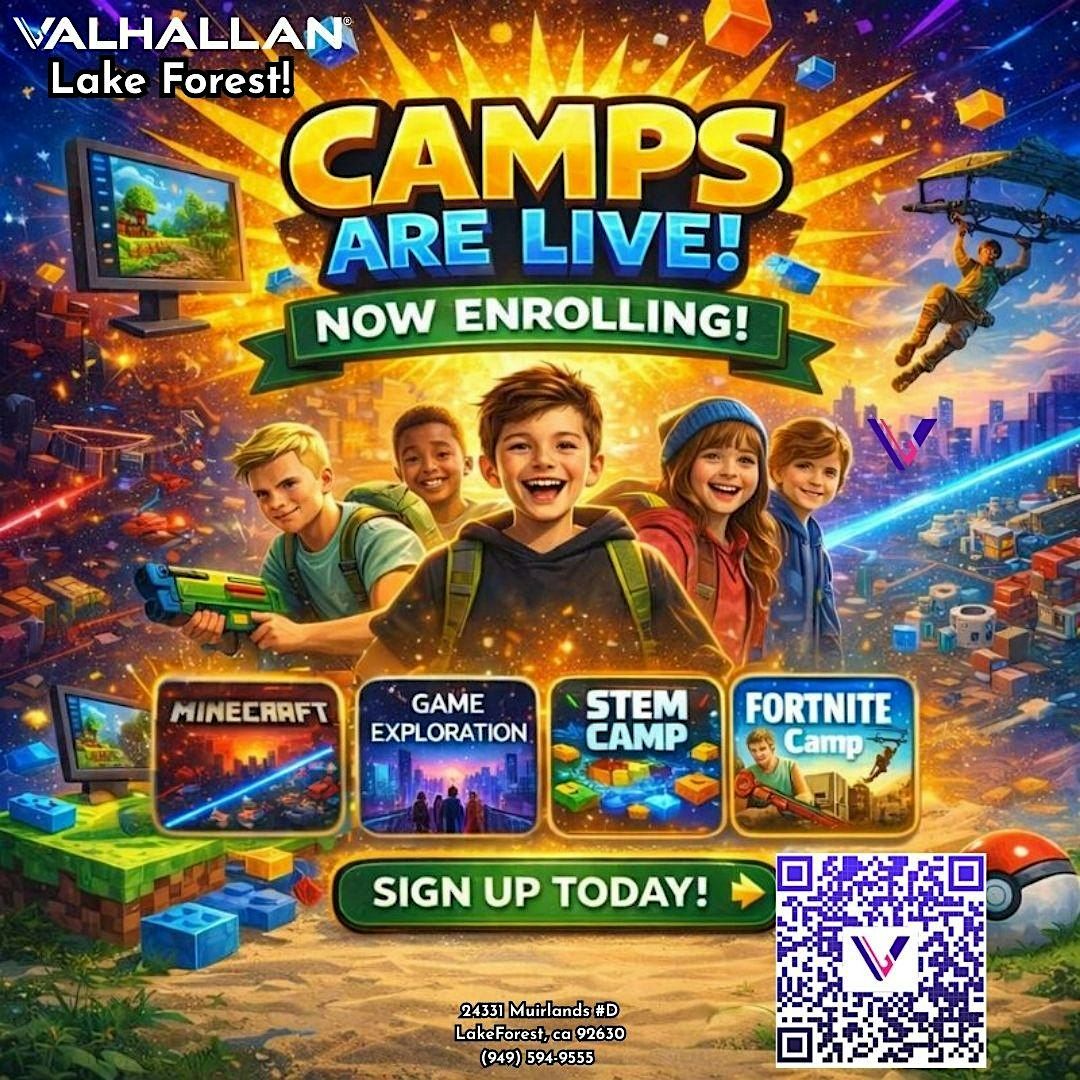 Give your child an experience they will actually look forward to every morning. Valhallan Lake Forest camps are designed for 1 to 5 days of fun, learning, and teamwork in a safe, coach led environment. Kids build confidence, make friends, and grow skills through structured gaming and hands on STEM activities that keep them engaged from start to finish.