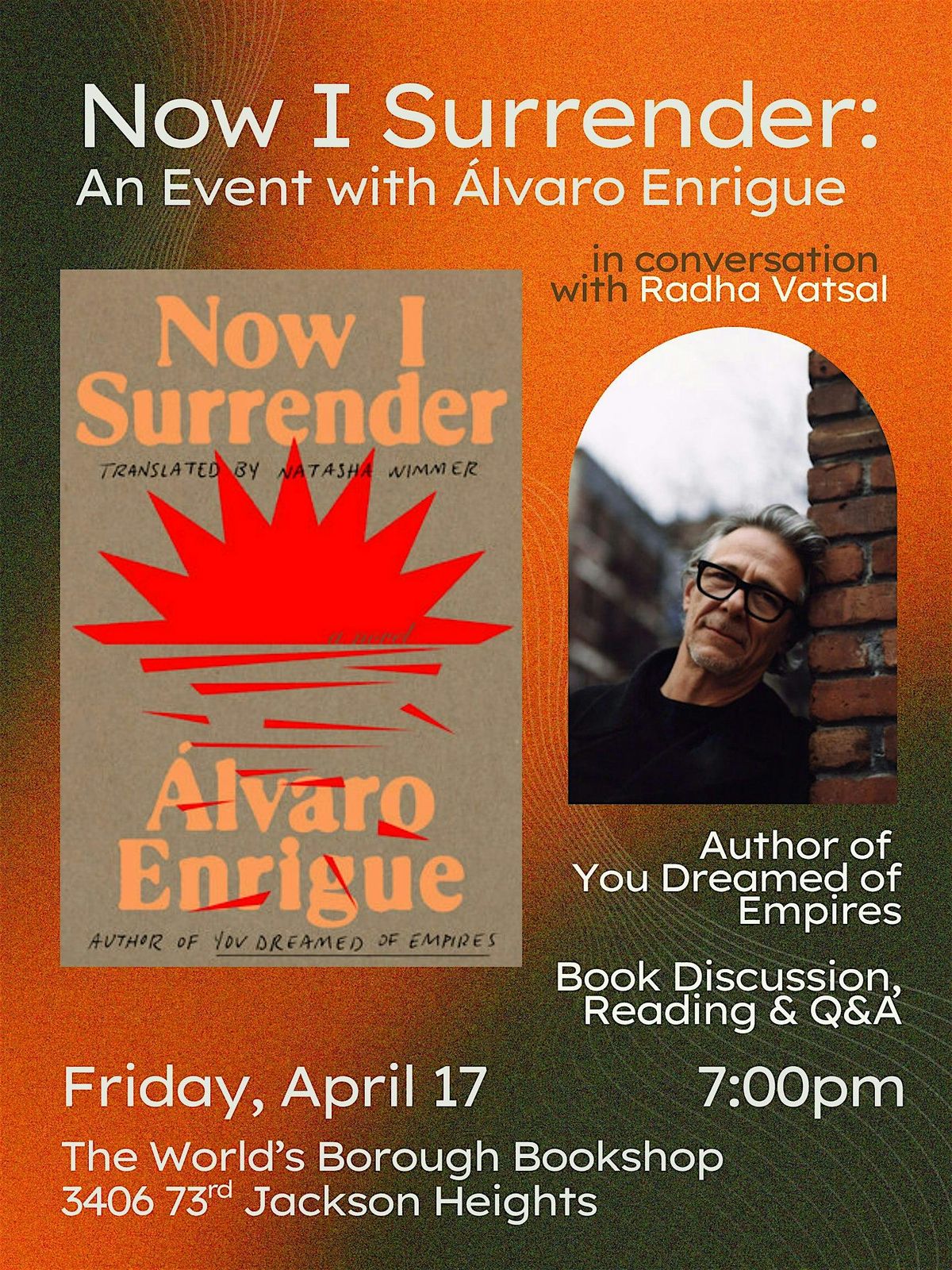 Join Álvaro Enrigue, author of You Dreamed of Empires, discussing his newest release Now I Surrender in conversation with Radha Vatsal.