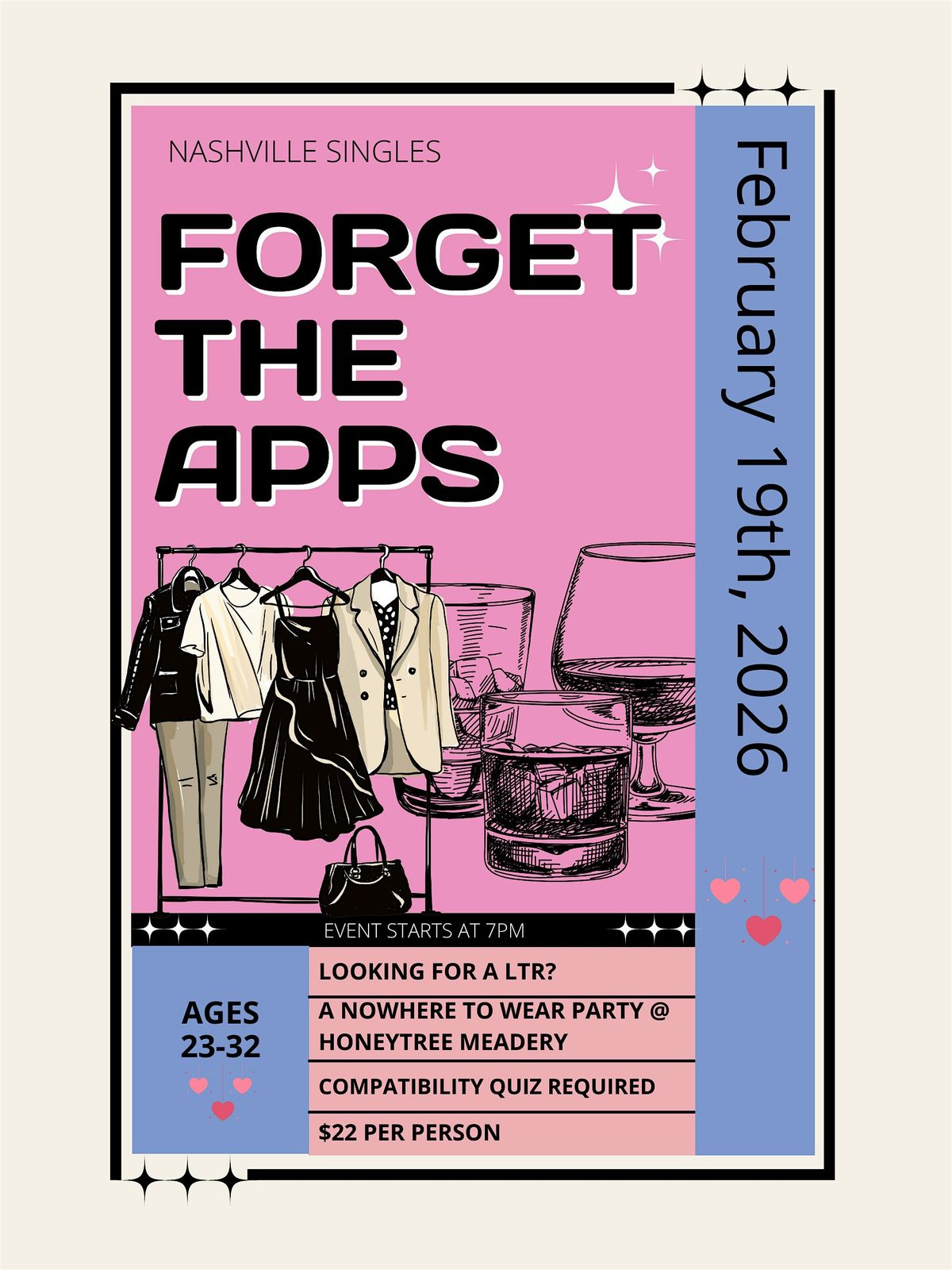 Tired of swiping? Ready for something real? Meet relationship-minded Nashville singles at HoneyTree Meadery for our "A Nowhere to Wear" themed drinks night.