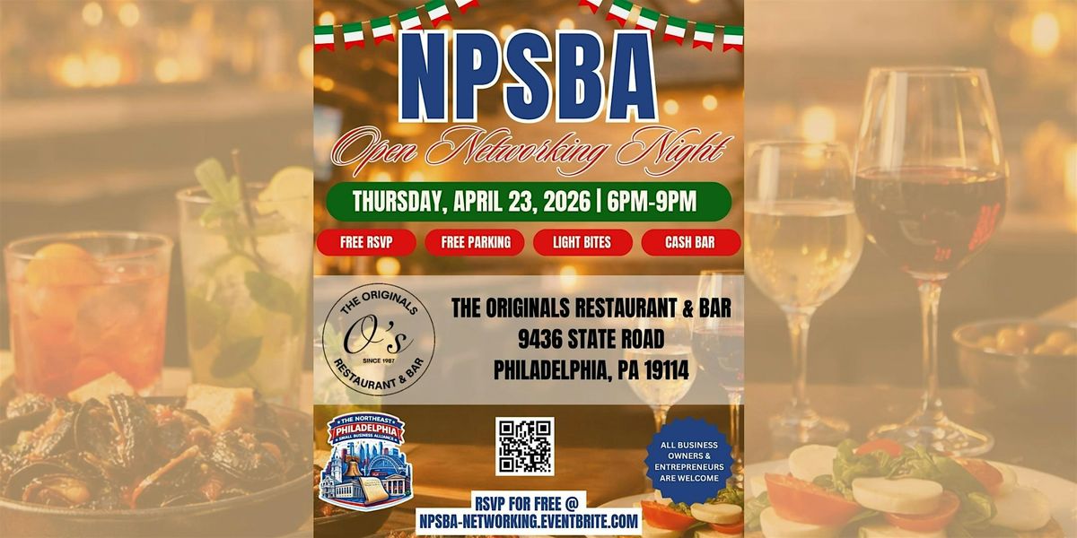 Join the Northeast Philadelphia Small Business Alliance for an evening of connections and collaboration at The Originals Restaurant & Bar in Northeast Philadelphia. NPSBA Open Networking Night will take place on Thursday, April 23, 2026 from 6 PM to 9 PM at 9436 State Road, Philadelphia, PA 19114 on the terrace. Business owners, entrepreneurs, and aspiring founders are invited to enjoy free admission, free parking, light bites, and a cash bar while networking in a warm and welcoming atmosphere designed to bring the local business community together.
