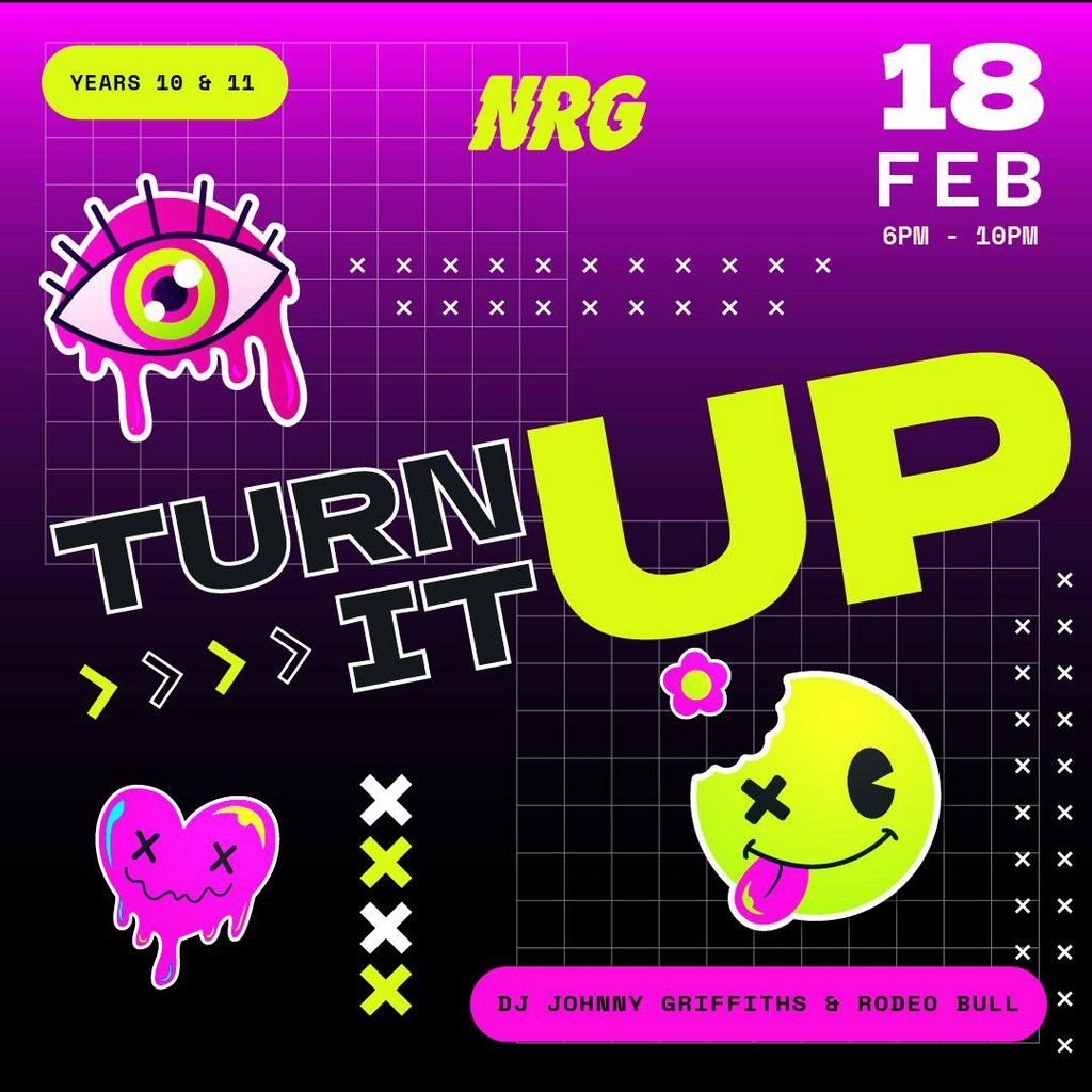 NRG Turn It Up for Years 10 & 11. Bigger tunes, heavier drops, full club vibes. Alcohol-free, fully supervised.