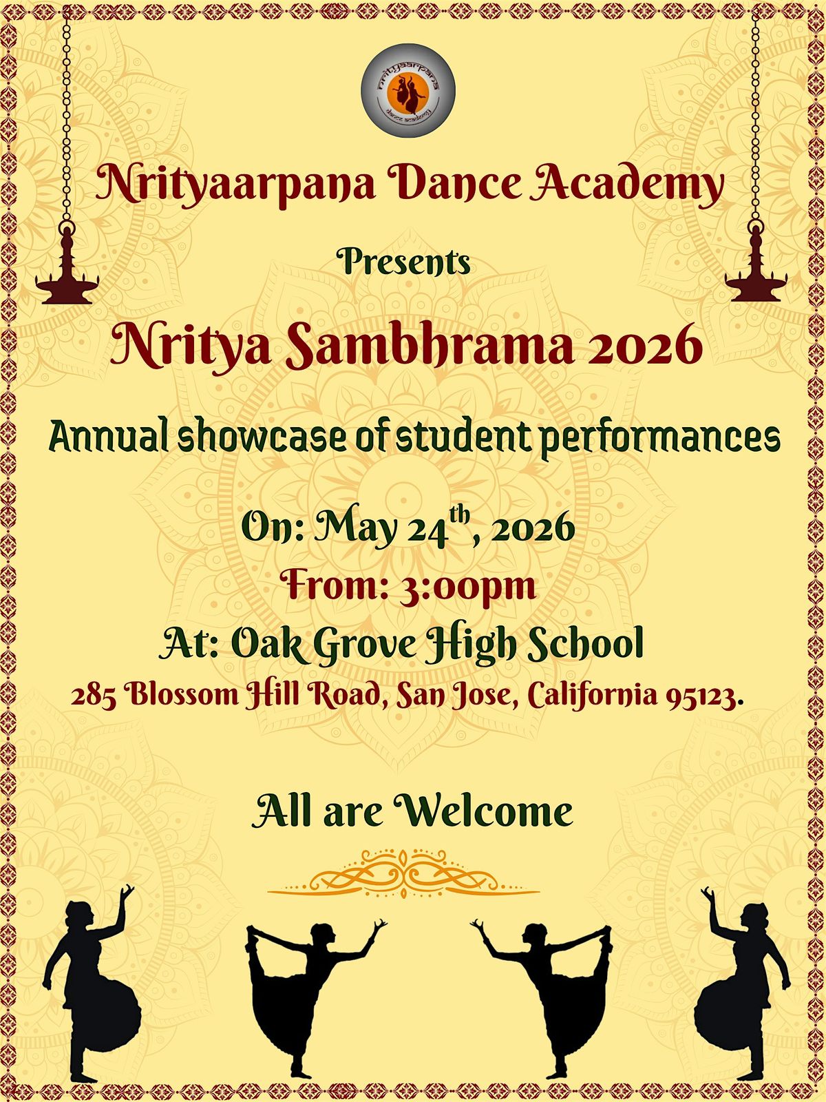 Nrityaarpana Dance Academy warmly welcomes you to the annual showcase of student peformances followed by a thematic presentation on the great epic Ramayana. Please join us on May 24th, 2026 from 3pm at Oak Grove High School , San Jose. This event is open to all.