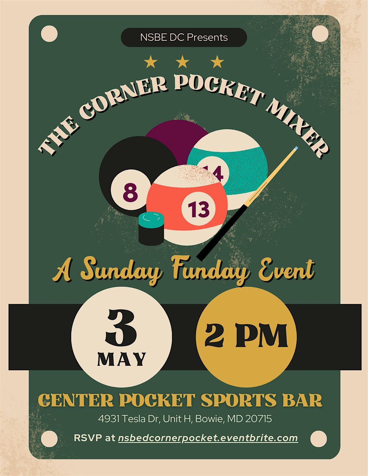 Come join the NSBE DC Family for The Corner Pocket Mixer: A Sunday Funday Event at the Center Pocket Sports Bar in Bowie, MD. The weather is getting warm and nice, so make sure to come out! We will have our own private room and a couple of pool tables just for our crew. There will also be exclusive access to games such as darts, Giant Jenga, Connect 4, Ping Pong, and your typical card games (and all day Happy Hour)! Name tags will be provided along with stickers to identify your career field and if you are looking for new opportunities or offering them. Get to know someone new!
