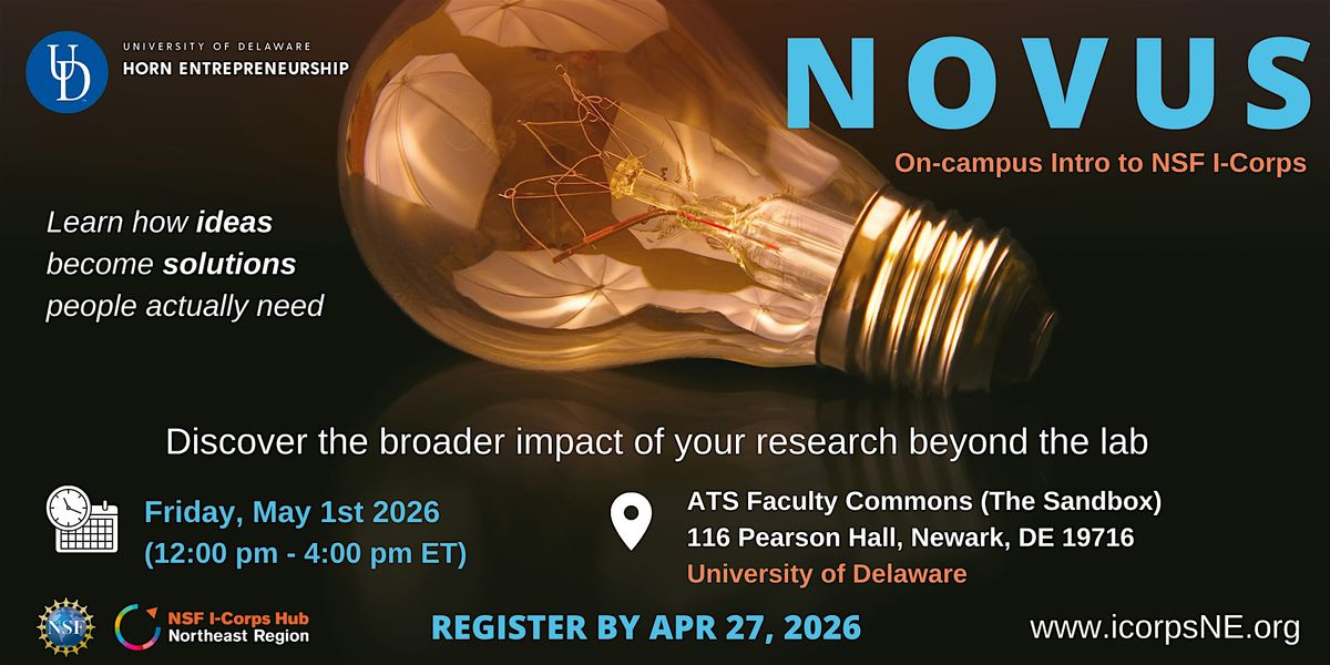 Learn about the impact your research or innovation could have in solving real-world problems by attending our Novus I-Corps Program at University of Delaware, a half-day introduction to I-Corps, co-hosted by , , and the .