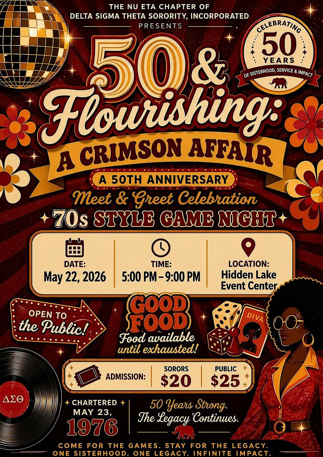 Step into a night of fun, flavor, and nostalgia at our 70’s Theme Game Night Mixer, part of the 50th Anniversary celebration, 50 & Flourishing: A Crimson Affair. This high energy kickoff event brings together the spirit of sisterhood with a throwback twist featuring food, music, games, laughter, and vibrant 70’s vibes.