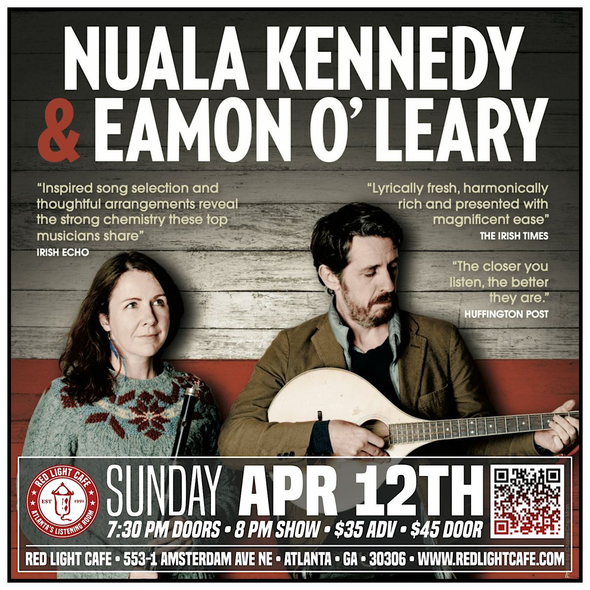 Noted for their instrumental skills and songwriting, Nuala Kennedy (flutes, whistles, vocals) and Eamon O’ Leary (guitar, bouzouki, vocals) are internationally recognized members of the traditional music community, with a diverse repertoire of traditional and contemporary song. With an engaging stage presence and understated virtuosity, they present a timeless selection of songs and instrumentals that range from the ancient Irish tradition to reflections on the present day.