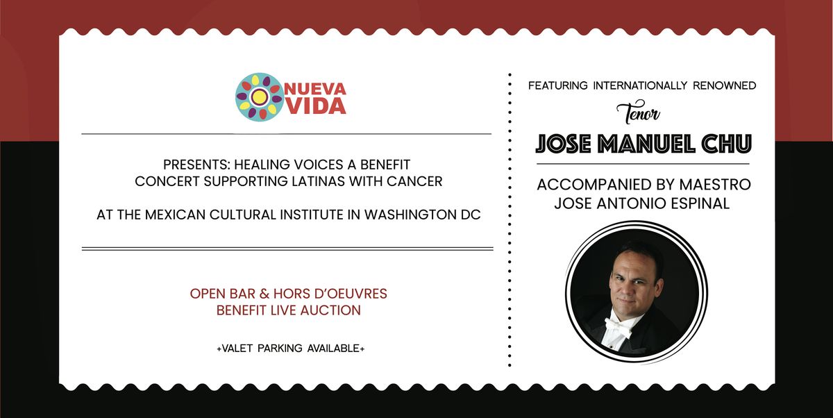 Experience internationally acclaimed tenor José Manuel Chu, accompanied by Maestro José Antonio Espinal, at the historic Mexican Cultural Institute on February 27th at 7:00 PM. The evening includes open bar, hors d'oeuvres and a live benefit auction. Valet parking will be available. 100% of proceeds benefit Nueva Vida, a non-profit organization dedicated to providing essential resources, support services, and hope to Latina women and their families navigating their cancer journey.