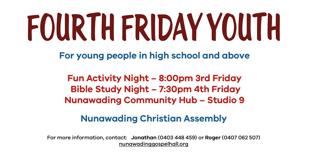 Learn and study Bible truths. Meet other young people in high school and above and join in some fun acitivities including singing. Held every 3rd Friday at 8 pm and 4th Friday at 7:30pm. All Welcome.